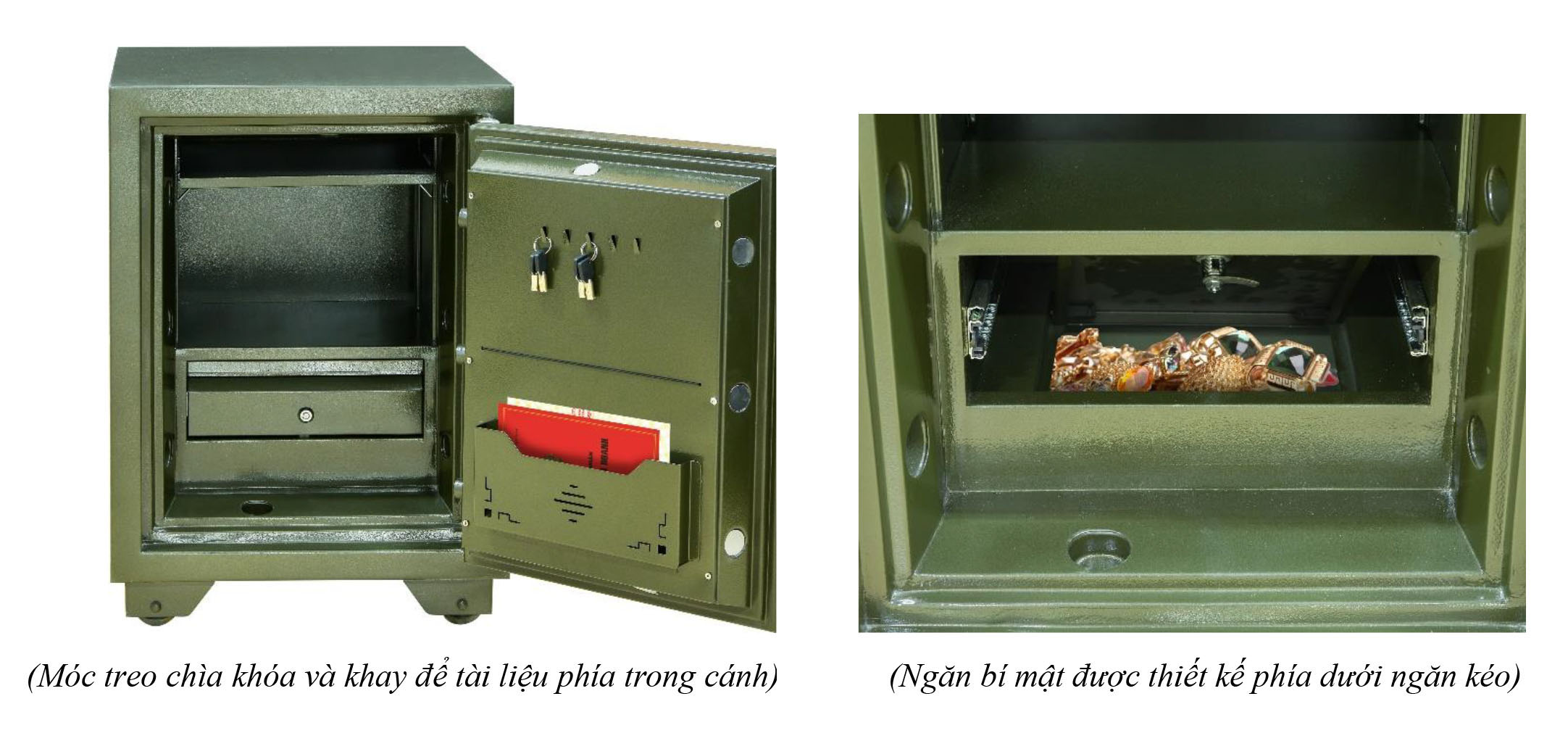 Bao gồm đợt di động cùng ngăn kéo được thiết kế có khóa, điểm độc đáo của két Legend là ngăn bí mật được khéo léo giấu phía dưới của ngăn kéo, đem lại sự tiện nghi tuyệt đối cho người sử dụng.