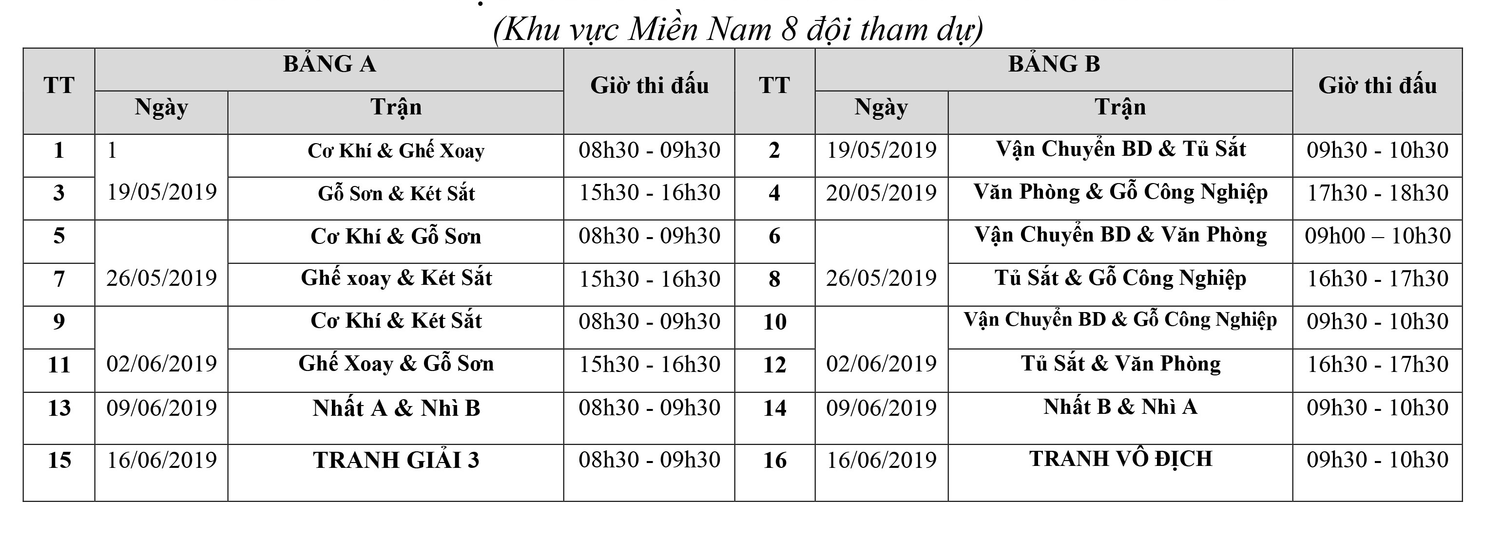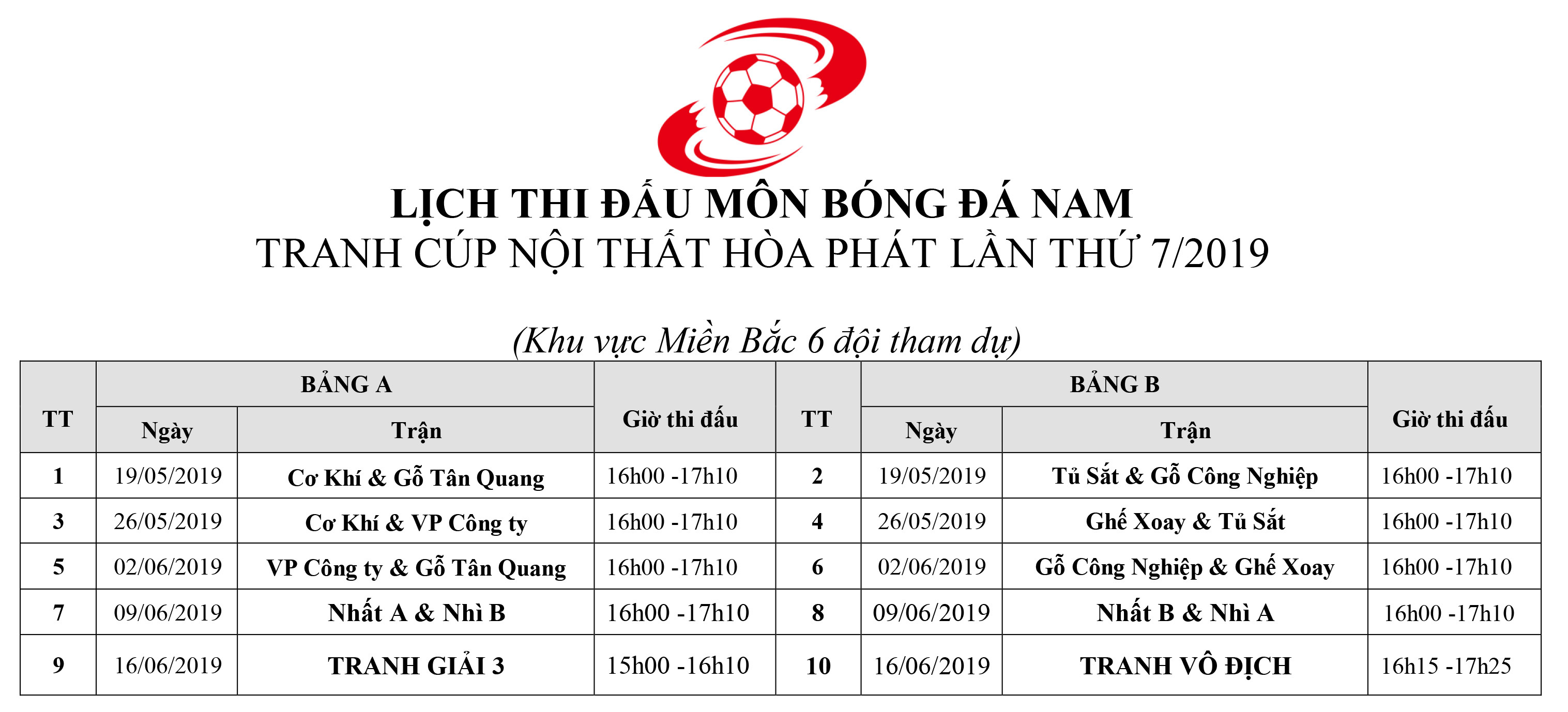 Theo như lịch thi đấu của Ban Tổ chức (BTC), giải đấu tranh cup Nội thất Hòa Phát bao gồm 14 đội bóng, thi đấu đồng thời tại 2 miền Nam, Bắc. Tại khu vực phía Bắc, 6 đội bóng đại diện cho các nhà máy Gỗ Tân Quang, Gỗ Công nghiệp, NM Tủ sắt, NM Cơ Khí, NM Ghế xoay và VP công ty sẽ thi đấu chính thức tại Sân bóng đá Phương Anh, trường Đại học Nông nghiệp, Trâu Qùy, Gia Lâm, Hà Nội. Trong khi đó, khu vực phía Nam với 8 đội bóng đại diện cho các nhà máy sản xuất tại Bình Dương sẽ thi đấu tại Sân bóng đá Trâm Anh, TP Thủ dầu một, TP Bình Dương.