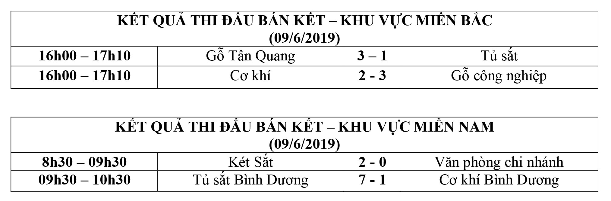 Tại khu vực phía Nam, trận bán kết 1 giữa Két sắt (KS) – Văn phòng chi nhánh (VPCN) được các CĐV cổ vũ sôi động. Bước vào trận đấu với tinh thần hừng hực quyết tâm, VPCN tung ra đội hình mạnh nhất với hàng loạt chân sút “hạt giống”, dự định đè bẹp tuyến phòng thủ KS. Không như dự định, KS thể hiện bản lĩnh với hàng phòng thủ vững vàng cùng màn tấn công xuất sắc, đẩy lùi được hầu hết các đợt đe dọa khung thành từ VPCN. Không để các cầu thủ VPCN trấn tĩnh, KS lần lượt thể hiện nhiều đường tấn công mạnh mẽ, kết thúc trận đấu với tỷ số 2- 0 từ màn lập công của cầu thủ Văn Chung, Minh Hoàng, chính thức bước vào vòng chung kết cúp Nội thất Hòa Phát khu vực phía Nam.