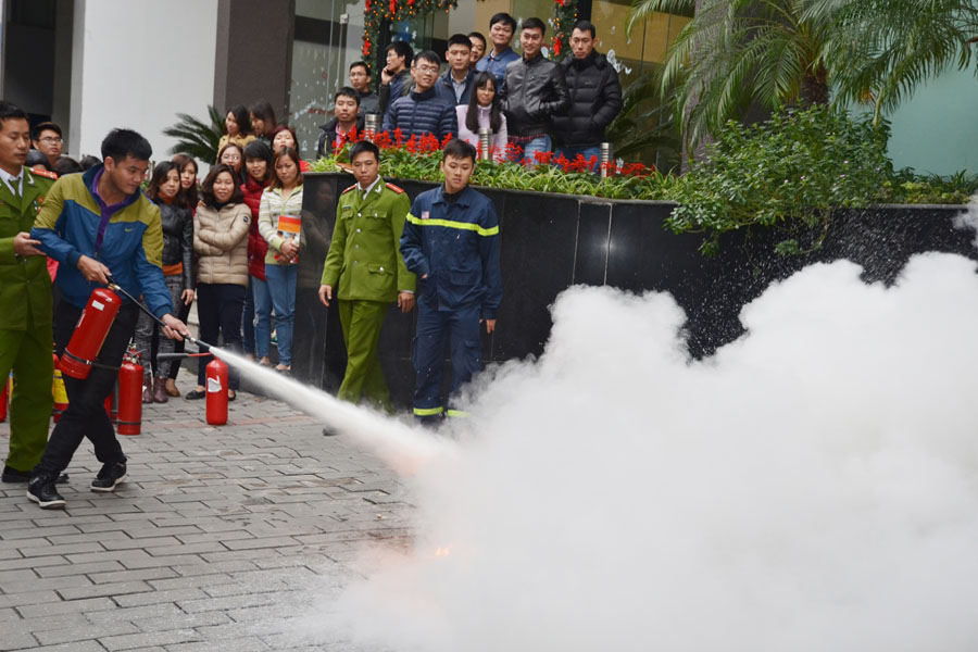 Kết thúc giờ học lý thuyết, các học viên đã được tập huấn phương án PCCC thông qua lực lượng Cảnh sát PCCC Hà Nội. Các học viên được hướng dẫn sử dụng và thực hành tại chỗ các trang thiết bị chữa cháy như: bình cứu hỏa, vòi rồng…và thực tập các phương án PCCC. Đây là hoạt động thiết thực giúp lực lượng PCCC tại chỗ tìm ra phương án cứu hỏa tối ưu nhất, khống chế đám cháy nhanh nhất, đảm bảo thiệt hại ở mức tối thiểu về người và tài sản.