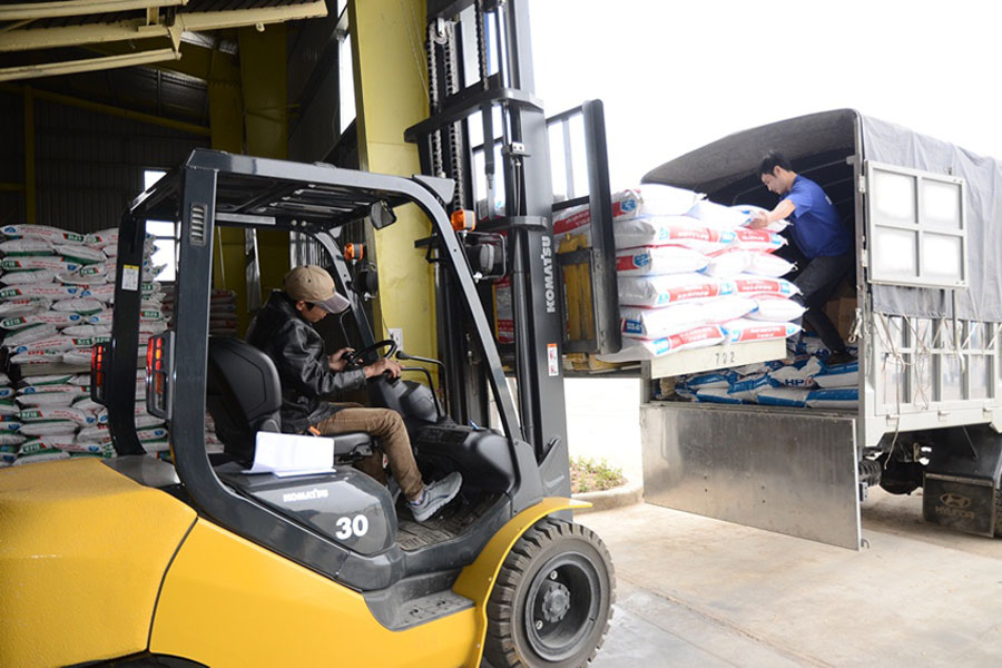 Tại kho của Nhà máy sản xuất thức ăn chăn nuôi Hòa Phát cũng liên tục xuất những xe hàng đầu tiên của năm Bính Thân.