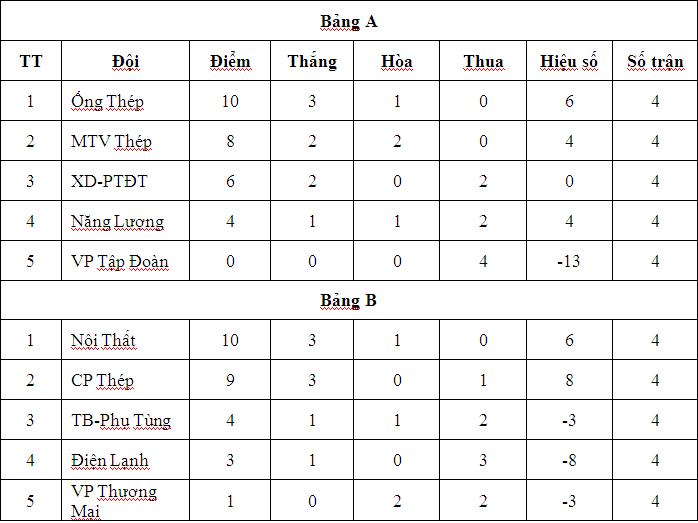 Như vậy, các đội vào bán kết đã được xác định gồm: Ống thép, MTV Thép (bảng A) và Nội thất, CP Thép của bảng B. Hai trận bán kết sẽ diễn ra vào lúc 13h30 ngày 22/10/2015 tại sân Bách Khoa – Hà Nội. Trận bán kết thứ nhất là màn so tài của Ống thép và CP Thép và trận còn lại là Nội thất – MTV Thép Hòa Phát.