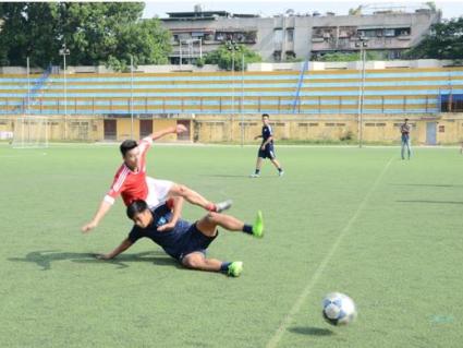 Cầu thủ XD Linh ( áo xanh) không ngại chơi rắn trước Ống Thép