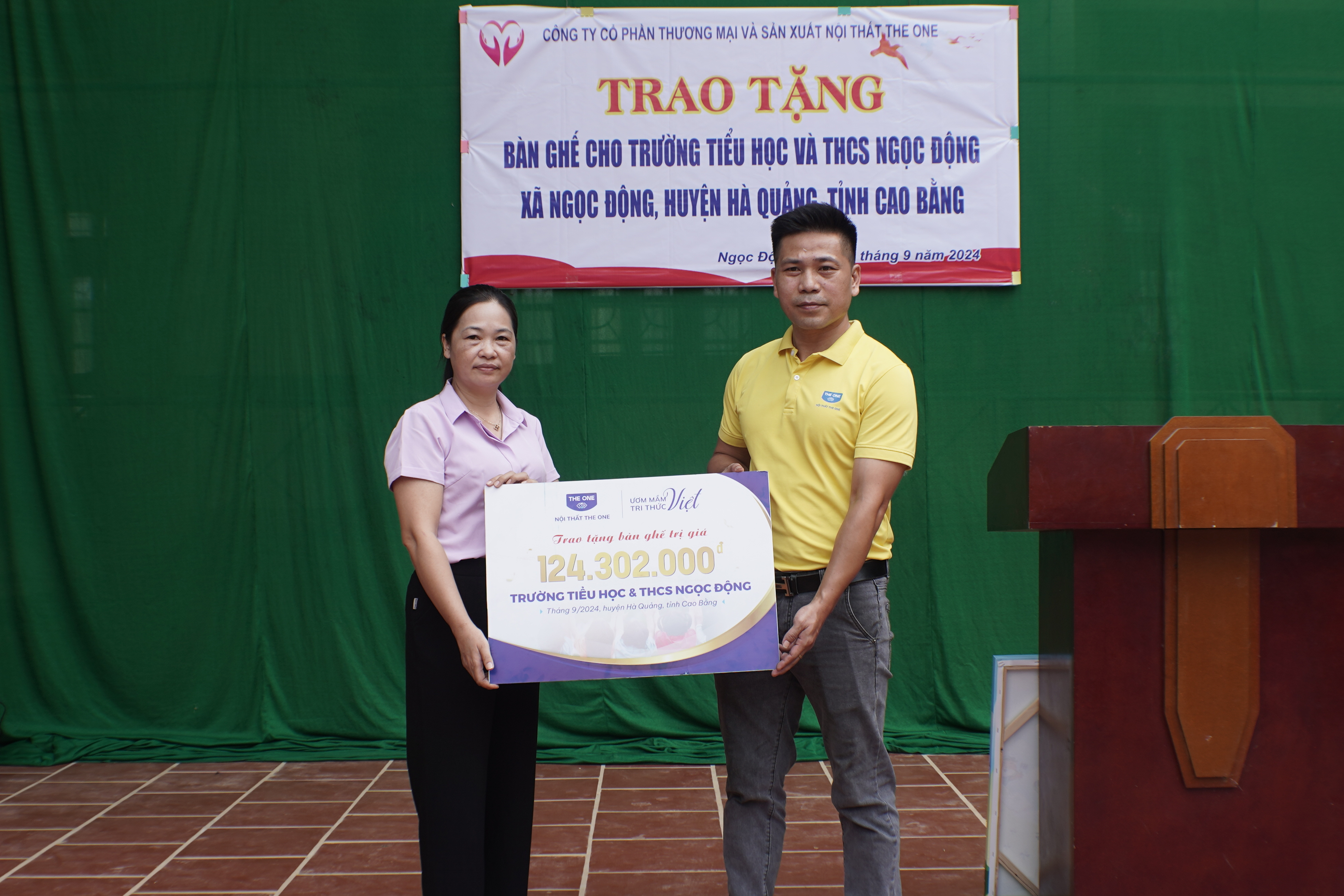 (Ông Lê Văn Thắng (áo vàng đứng giữa) đại diện Công ty cổ phần Thương mại và Sản xuất Nội thất The One trao tặng bàn ghế tới trường Tiểu học và Trung học cơ sở Ngọc Động, Cao Bằng)