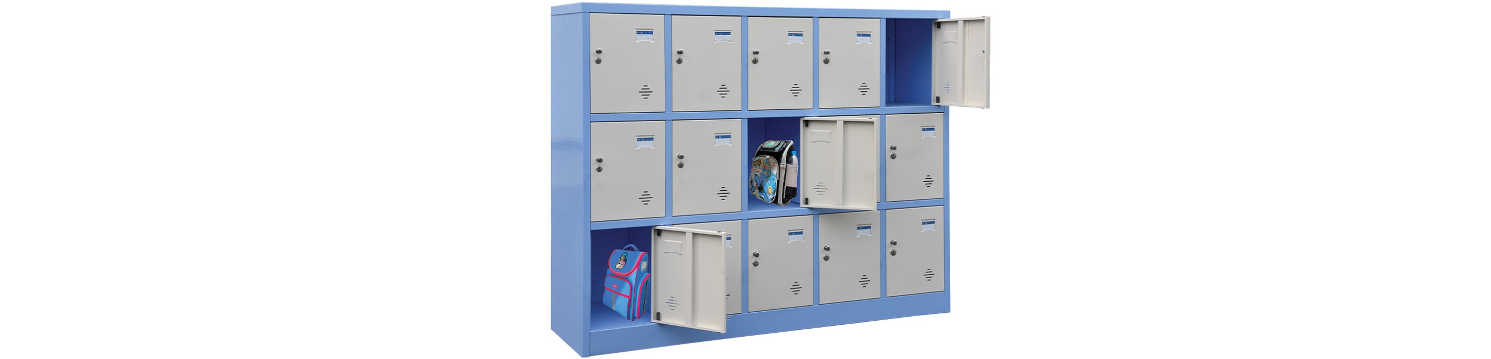 Tủ sắt sơn tĩnh điện 15 khoang cánh mở, kích thước phù hợp cho đối tượng học sinh mẫu giáo, tiểu học. Trên mỗi cánh có 1 khóa locker và 1 núm tay nắm