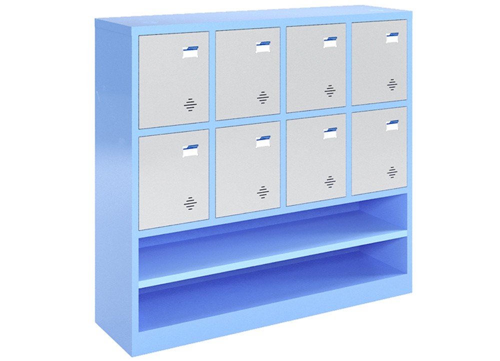 Tủ sắt sơn tĩnh điện có 8 cánh mở phía trên, phía dưới có ngăn trống để giày dép