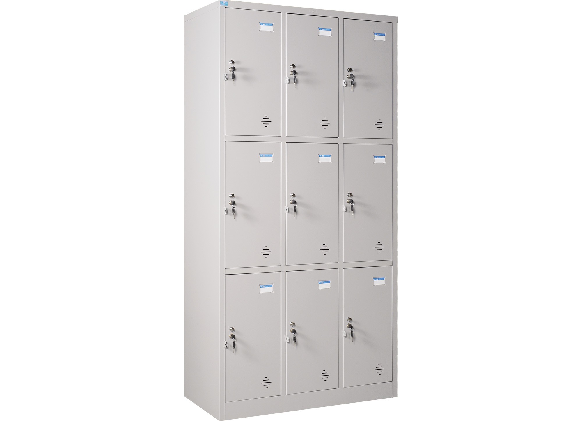 Tủ sắt sơn tĩnh điện 9 khoang cánh mở. Trên mỗi cánh có 1 khóa Locker, núm tay nắm và tai khóa móc.
