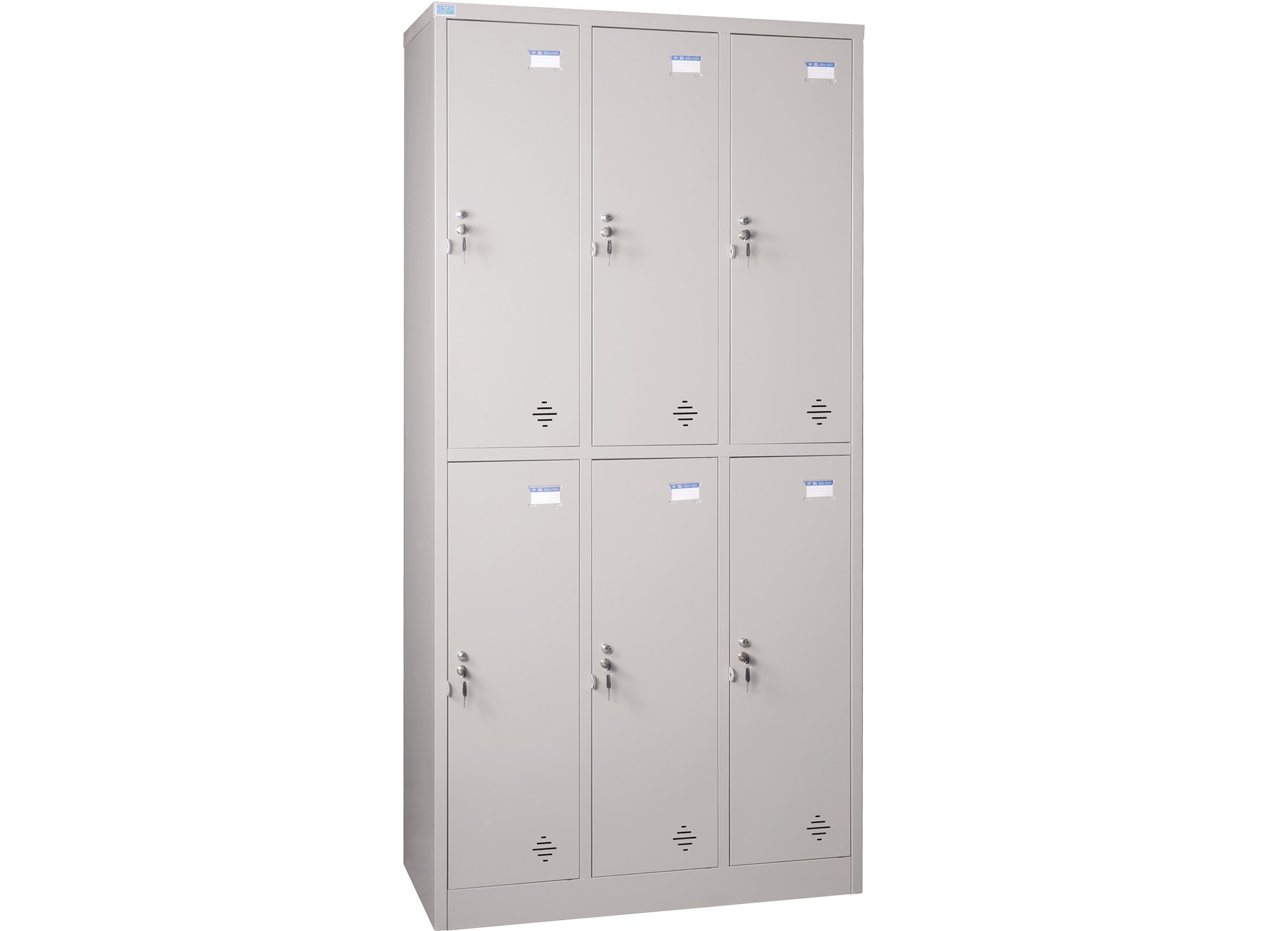 Tủ sắt sơn tĩnh điện 6 khoang cánh mở, bên trong mỗi khoang có 1 đợt cố định và 1 suốt treo quần áo. Trên mỗi cánh có 1 khóa Locker, núm tay nắm và tai khóa móc.