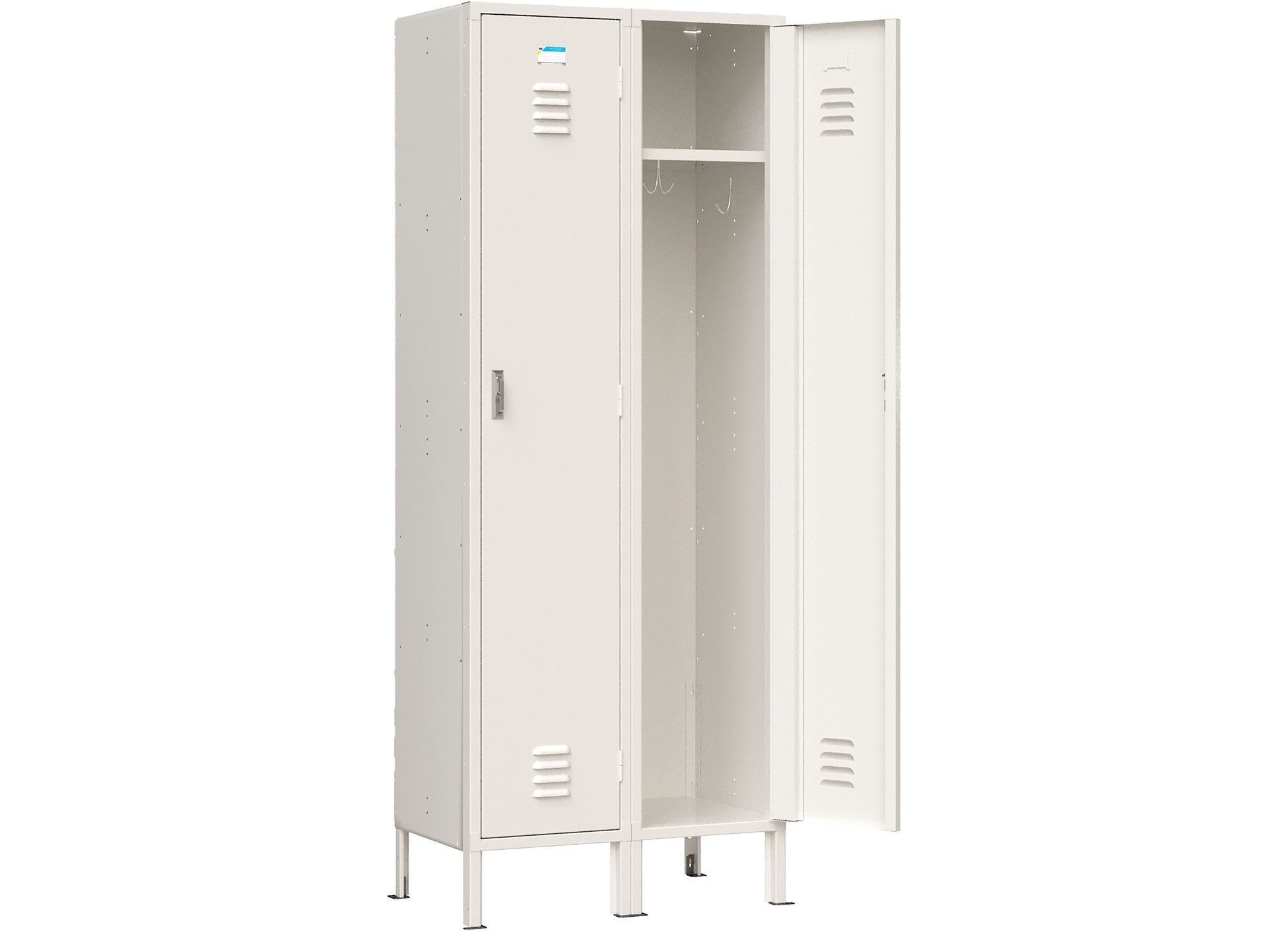 Tủ sắt sơn tĩnh điện màu trắng ngà.Tủ có 2 khoang cánh mở, bên trong mỗi khoang có 1 đợt cố định và 3 móc treo áo đơn, 1 móc treo áo đôi.
