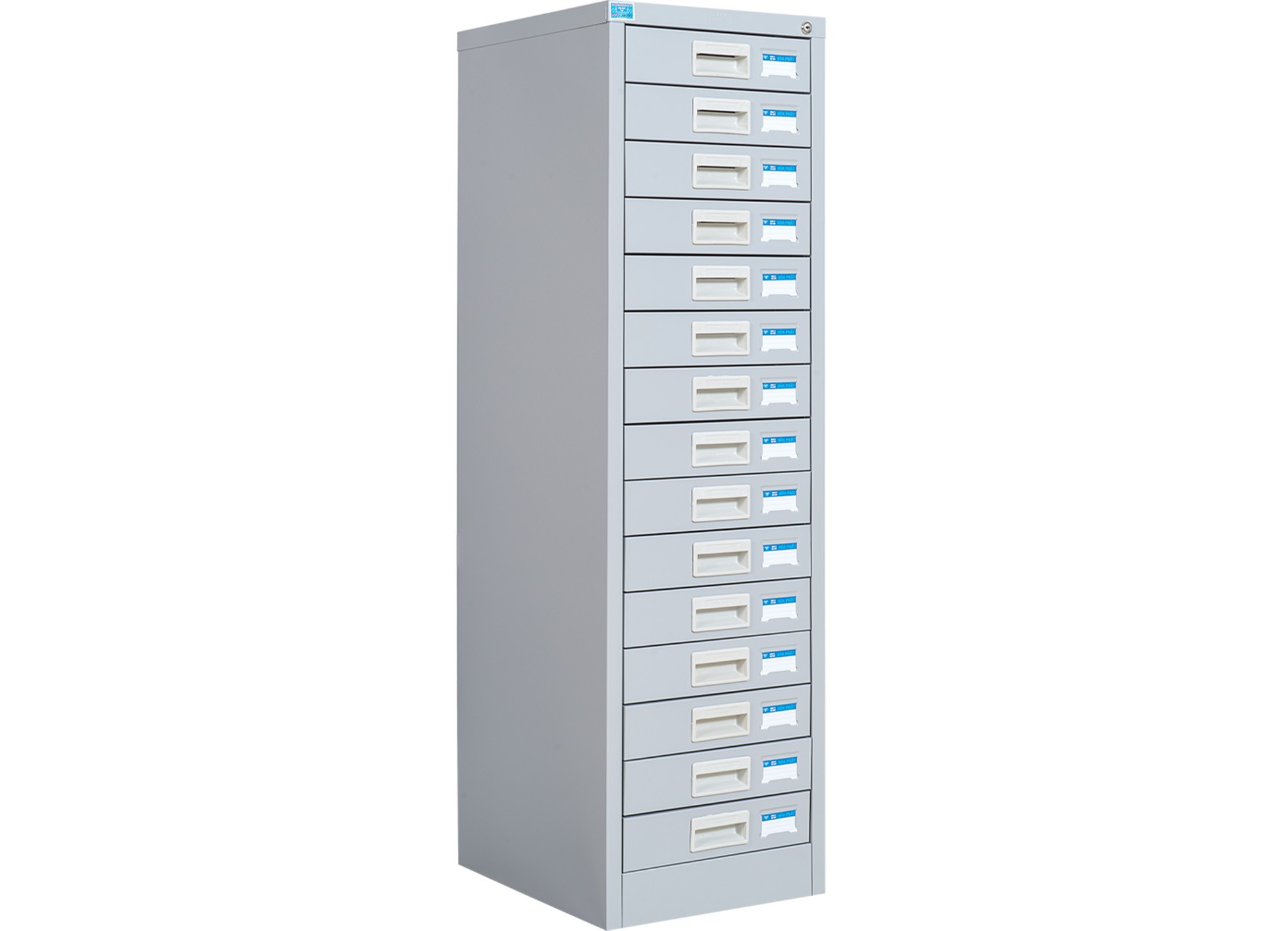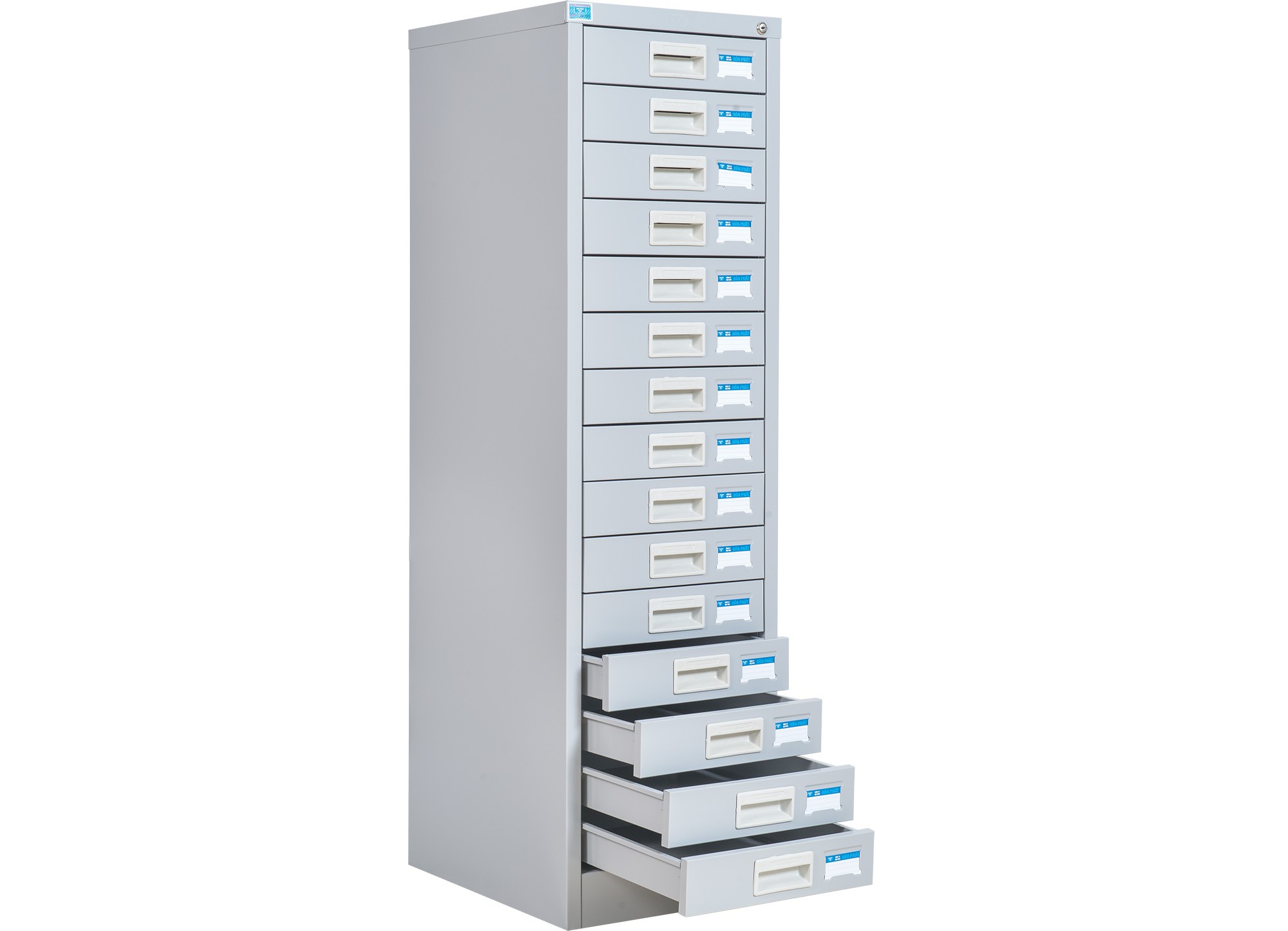 Tủ sắt sơn tĩnh điện gồm 15 ngăn kéo chuyển động bằng cơ cấu ray thép uốn.