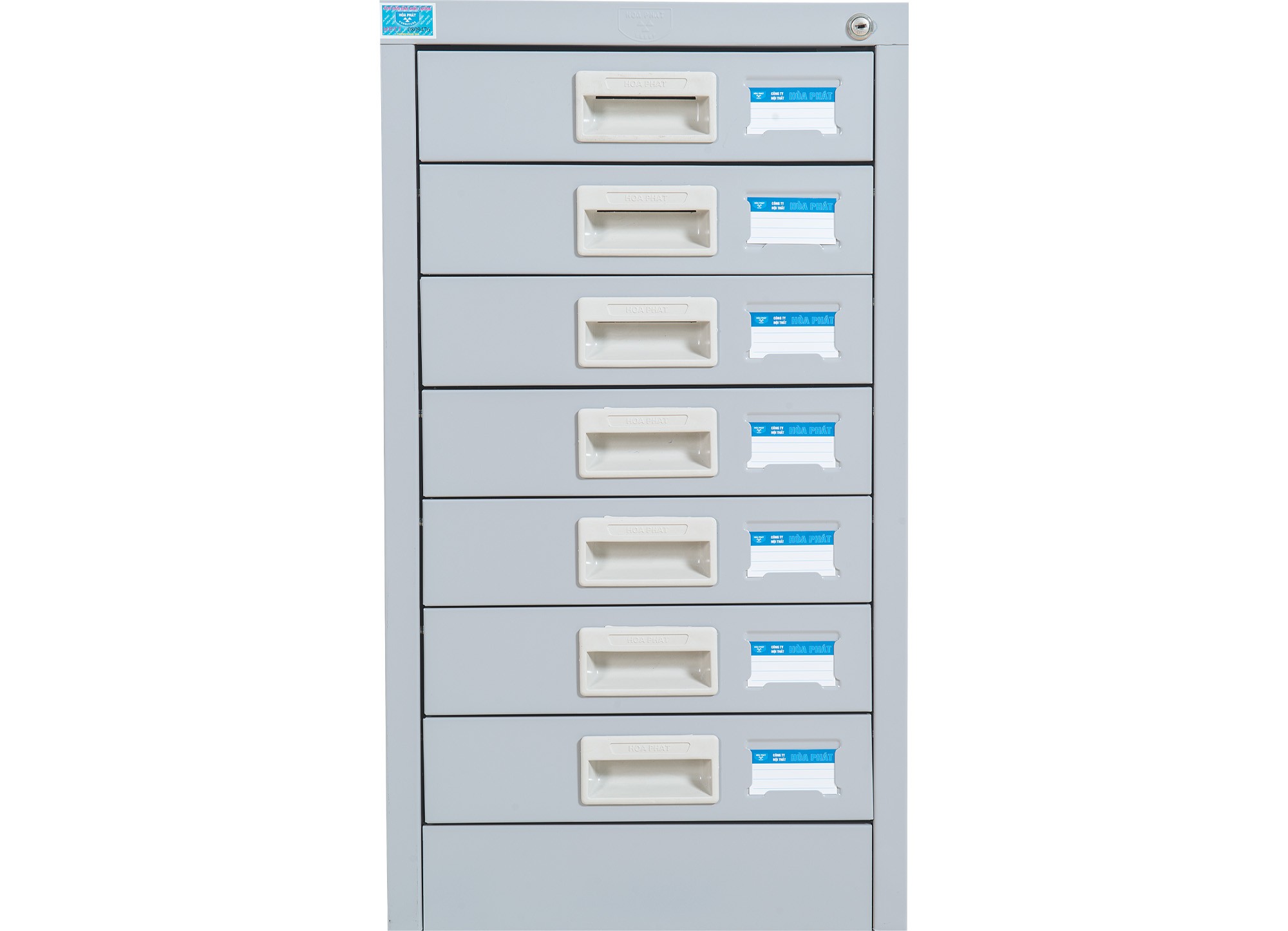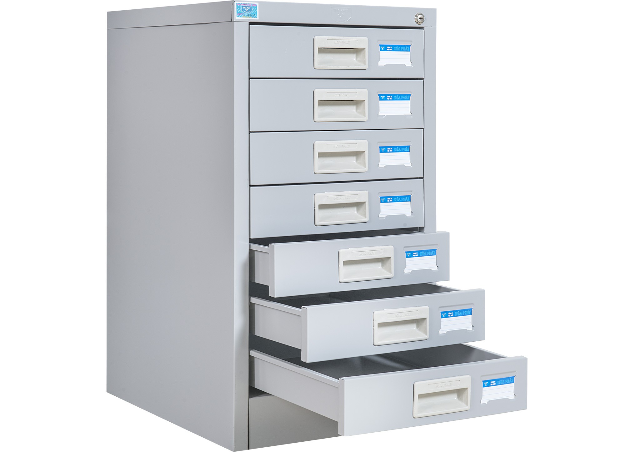 Tủ sắt để file sơn tĩnh điện gồm 7 ngăn kéo chuyển động bằng cơ cấu ray thép uốn.