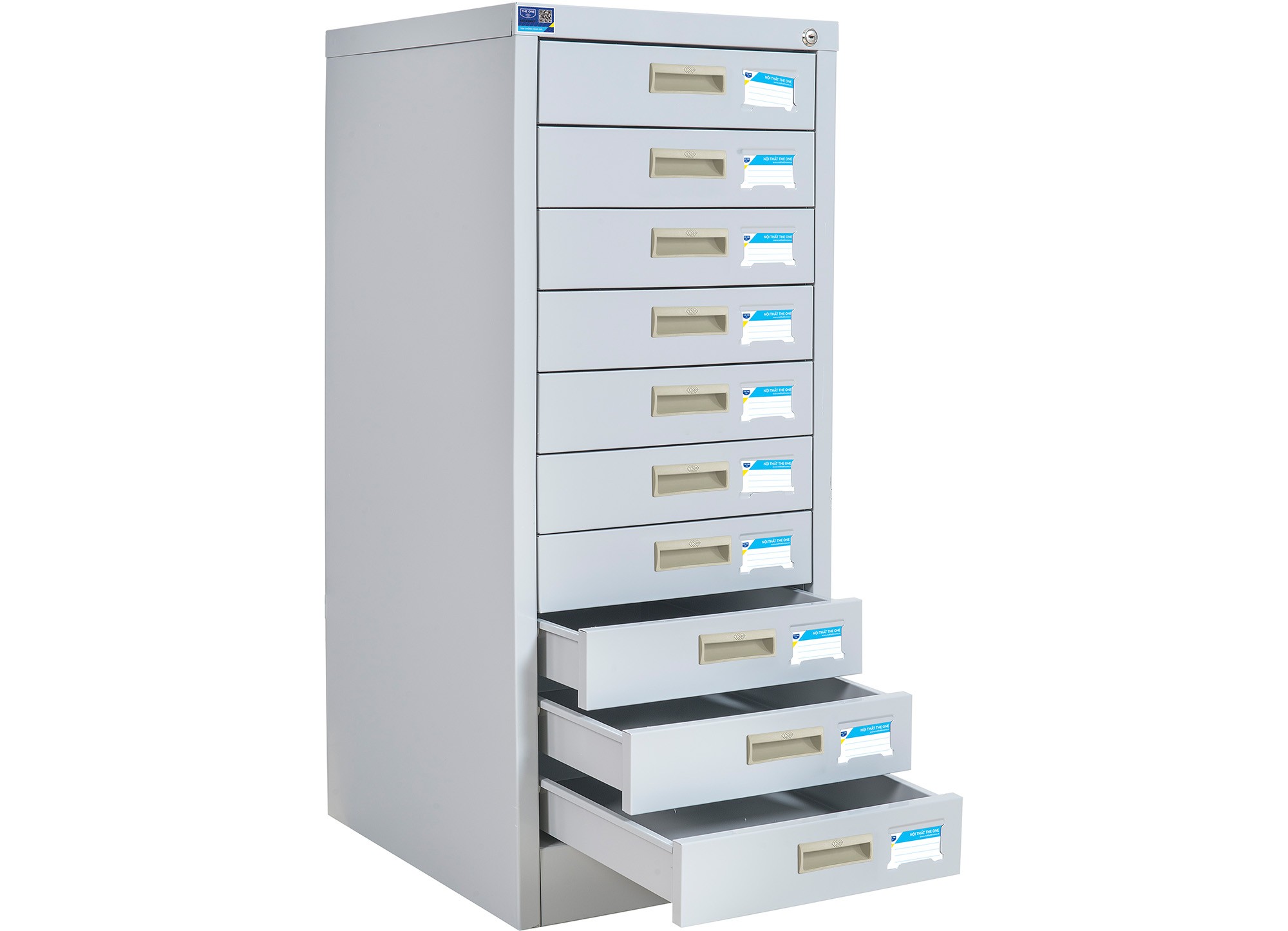 Tủ sắt để file sơn tĩnh điện gồm 10 ngăn kéo chuyển động bằng cơ cấu ray thép uốn.