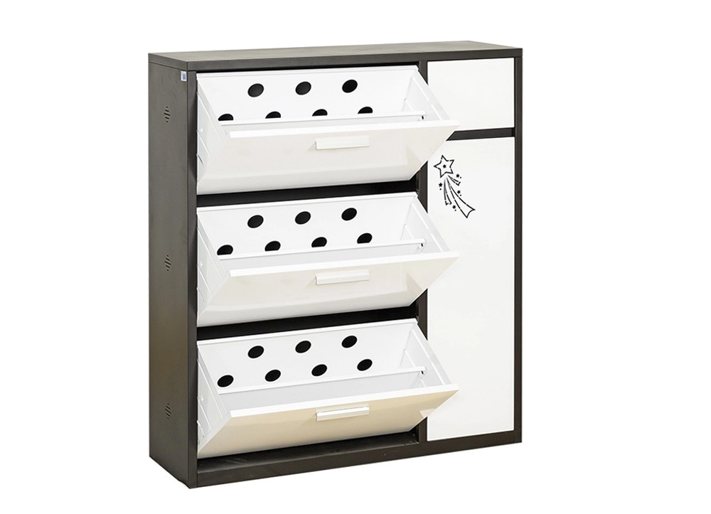 Tủ để giày thân sơn màu cà phê kết hợp cánh màu trắng có hoa văn trang trí cắt laze. Tủ có 2 khoang, khoang trái có 3 ngăn kéo lật, khoang phải có 1 ngăn kéo để đồ và 1 cánh mở, trong khoang cánh mở có 2 đợt di động