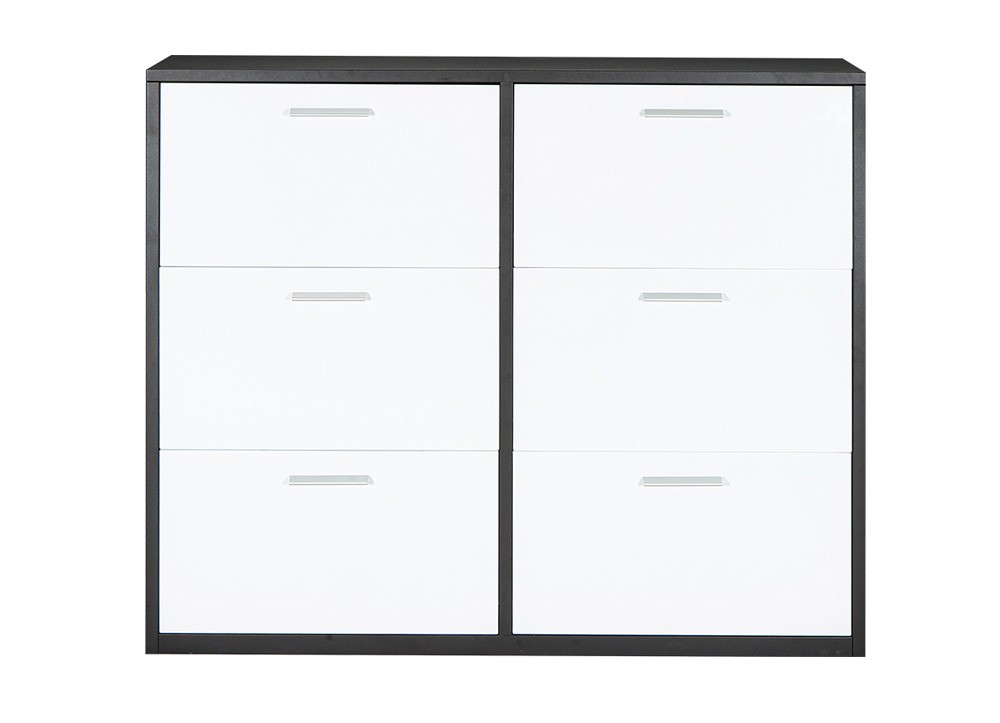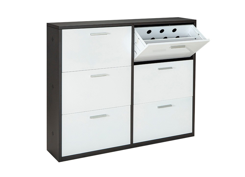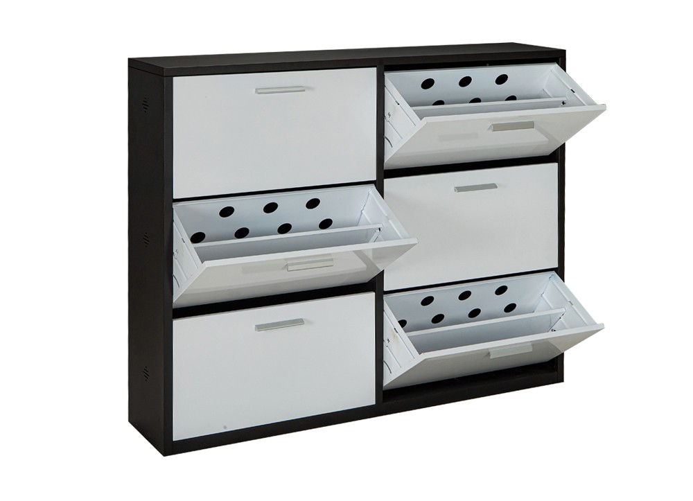 Tủ để giầy có 2 khoang, mỗi khoang có 3 ngăn kéo lật. Bên trong mỗi ngăn lật có 1 đợt chia hai tầng để giầy