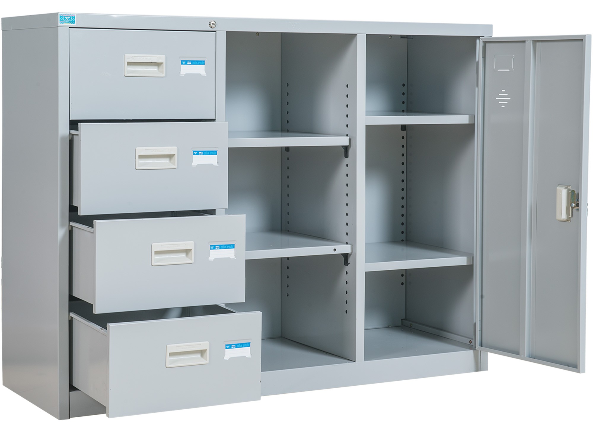 Tủ sắt sơn tĩnh điện 3 khoang: Khoang cánh sắt mở bên trong có 2 đợt di động. Khoang ở giữa có 2 đợt di động. Khoang 4 ngăn kéo sử dụng chung 1 thanh khóa dàn.