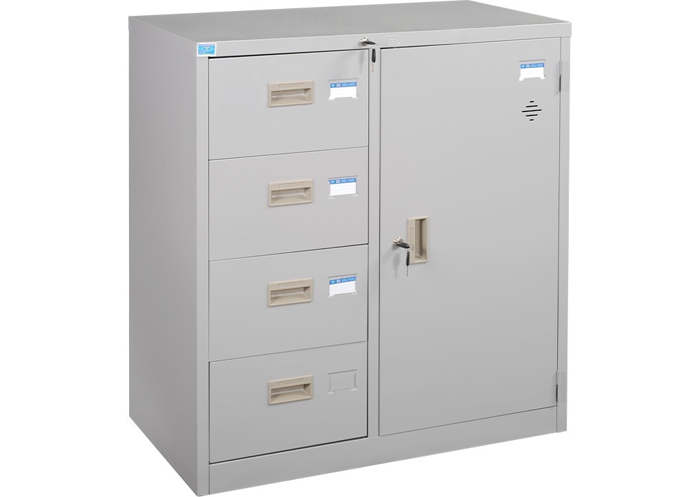Tủ sắt sơn tĩnh điện 2 khoang: Khoang cánh sắt mở bên trong có 2 đợt di động. Khoang 4 ngăn kéo sử dụng chung 1 thanh khóa dàn.