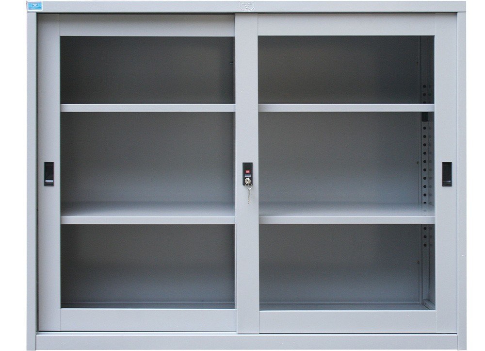 Tủ sắt sơn tĩnh điện 1 khoang và có 2 đợt di động, sử dụng 2 cánh kính lùa khung thép.