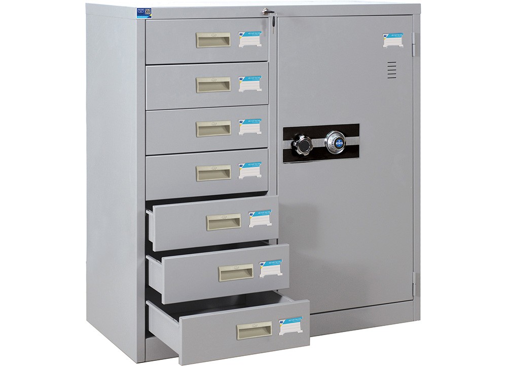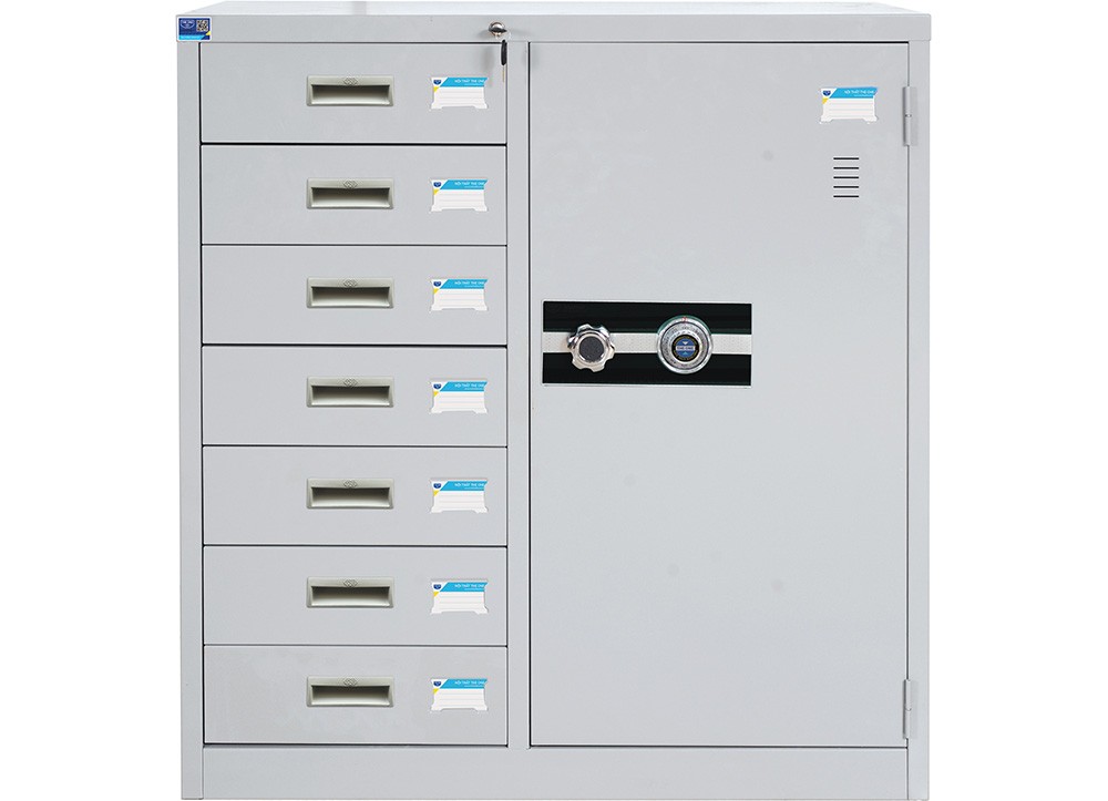 Tủ sắt sơn tĩnh điện 2 khoang: Khoang cánh sắt mở có 1 khóa mã, bên trong có 2 đợt di động. Khoang 7 ngăn kéo sử dụng chung 1 thanh khóa dàn.