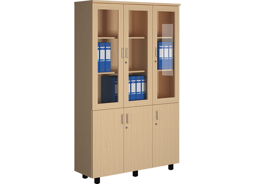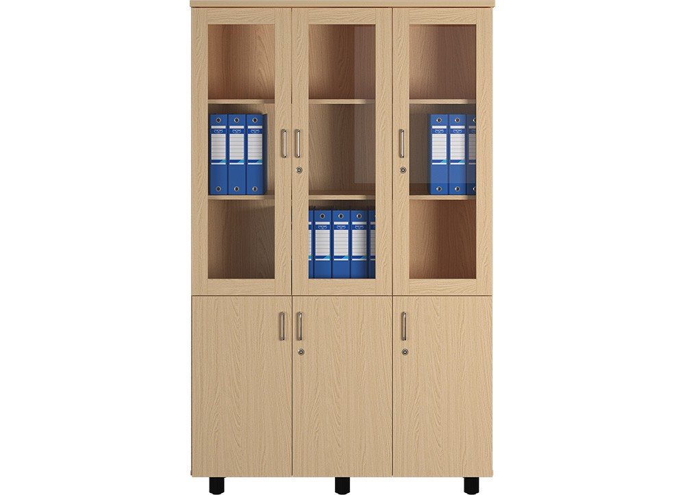 Tủ tài liệu 3 khoang chất liệu gỗ công nghiệp phủ melamine, bên trên gồm 3 khoang khung cánh kính có khóa, trong có 2 đợt di động.