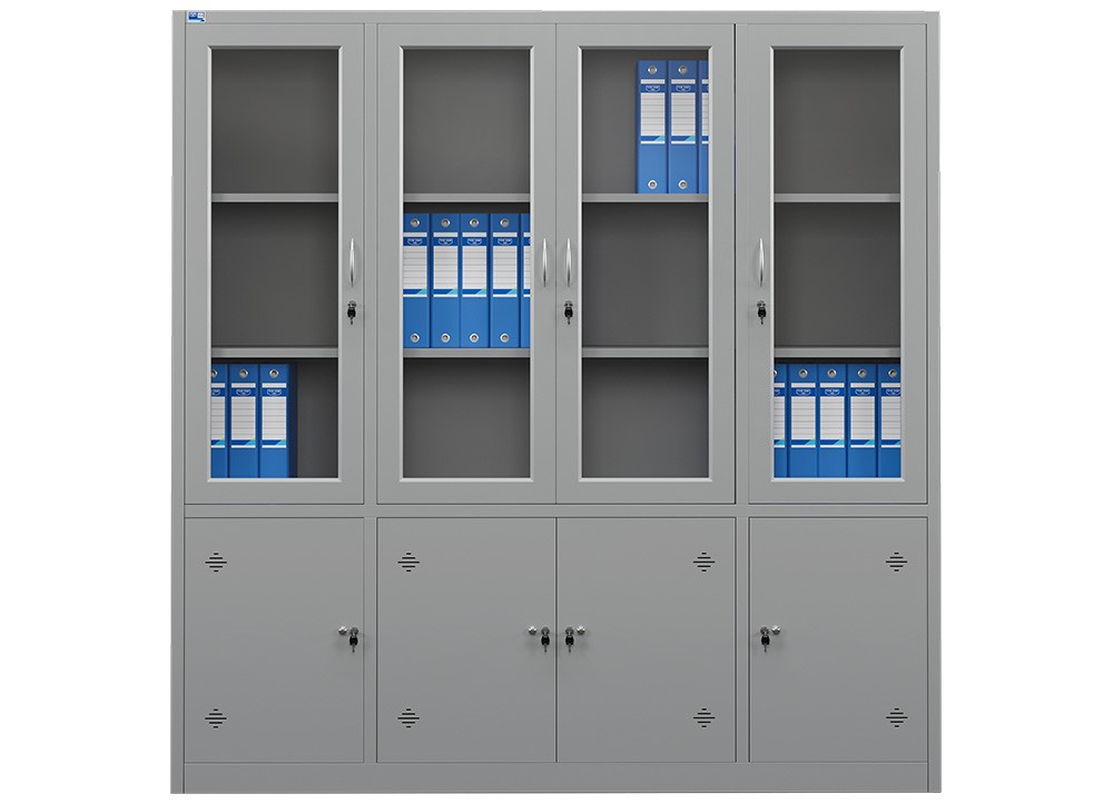 Tủ sắt để tài liệu sơn tĩnh điện gồm 7 khoang, phía trên 4 khoang cánh kính, mỗi khoang có 2 đợt di động.