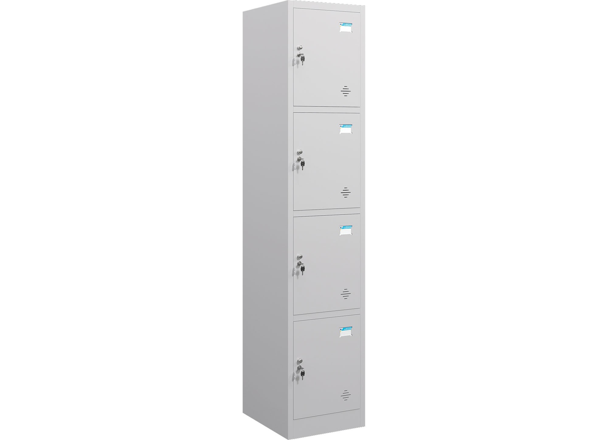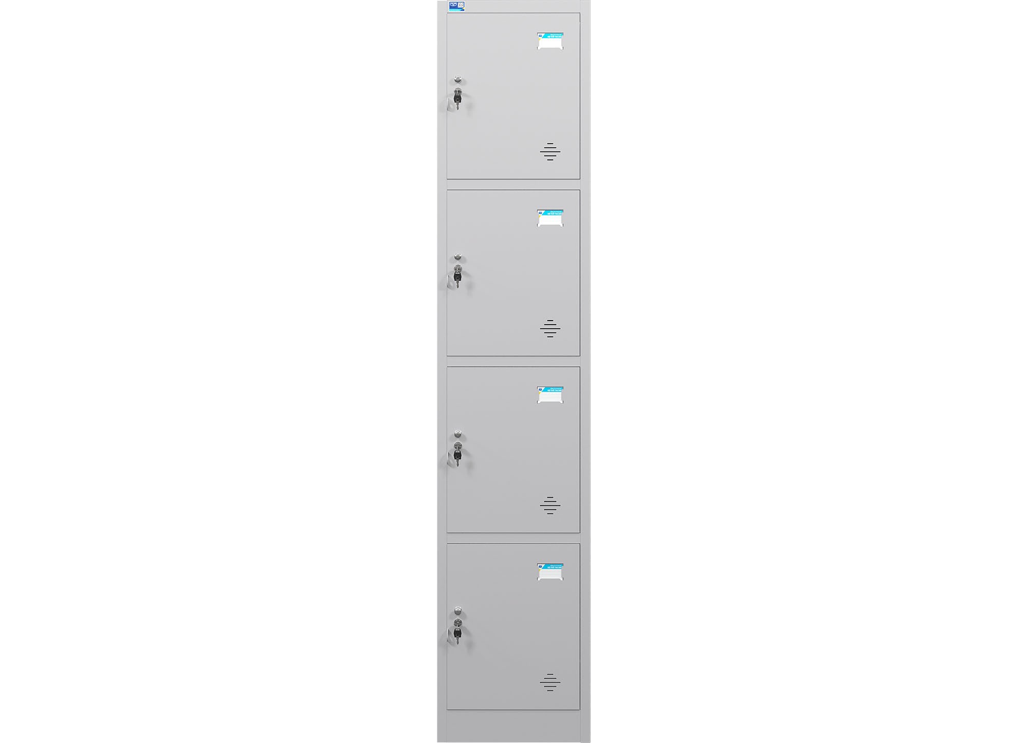 Tủ sắt sơn tĩnh điện 4 khoang cánh mở. Trên mỗi cánh có 1 khóa Locker, núm tay nắm và tai khóa móc.