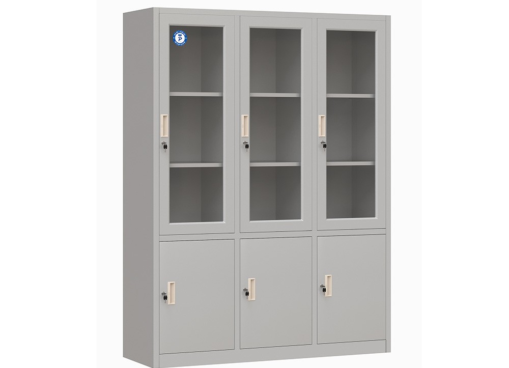 Tủ sắt sơn tĩnh điện gồm 6 khoang, bên trên là 3 khoang cánh kính mỗi khoang có 2 đợt cố định, bên dưới 3 khoang cánh sắt.