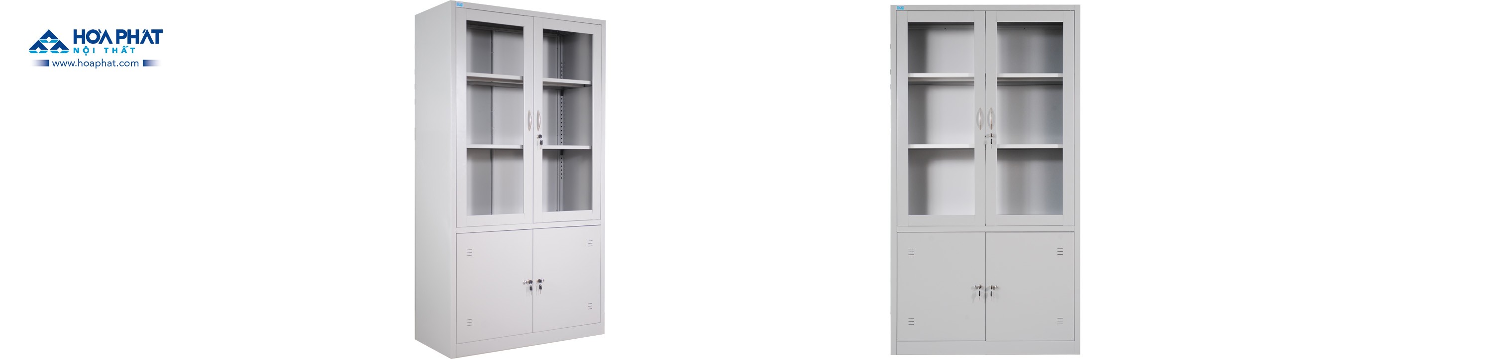 Tủ sắt sơn tĩnh điện 2 khoang: Khoang trên có 2 đợt di động và khung cánh kính mở. Khoang dưới có 2 cánh sắt mở.