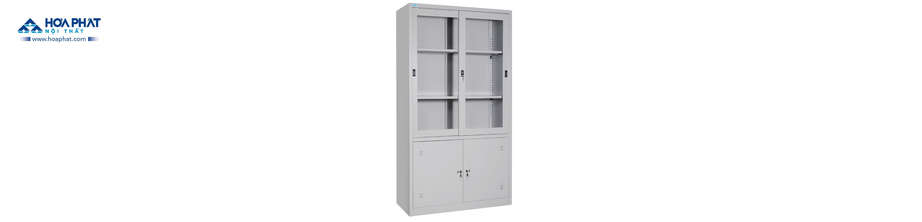 Tủ sắt sơn tĩnh điện 2 khoang: Khoang trên có 2 đợt di động và khung cánh kính lùa. Khoang dưới có 2 cánh sắt mở.