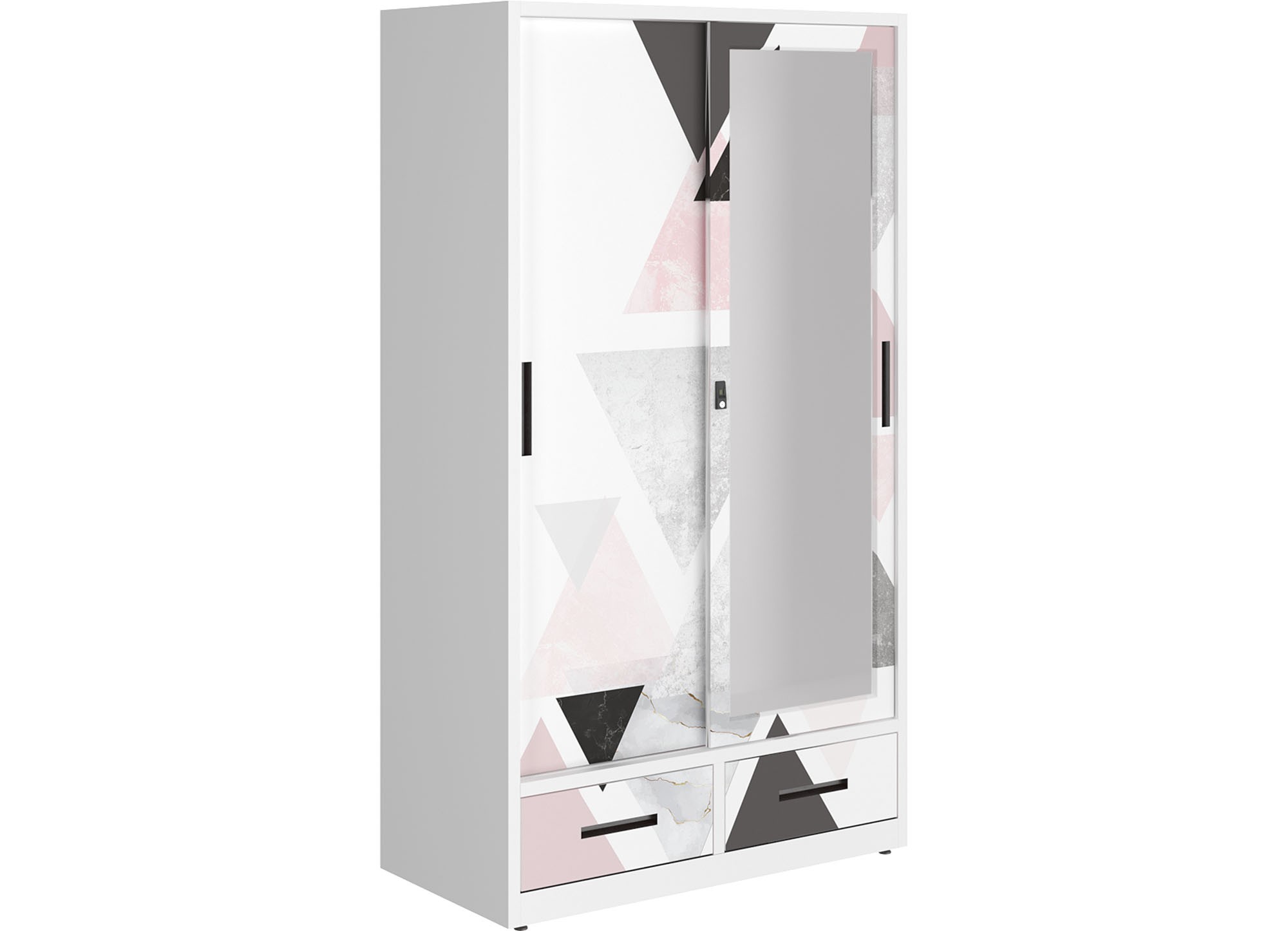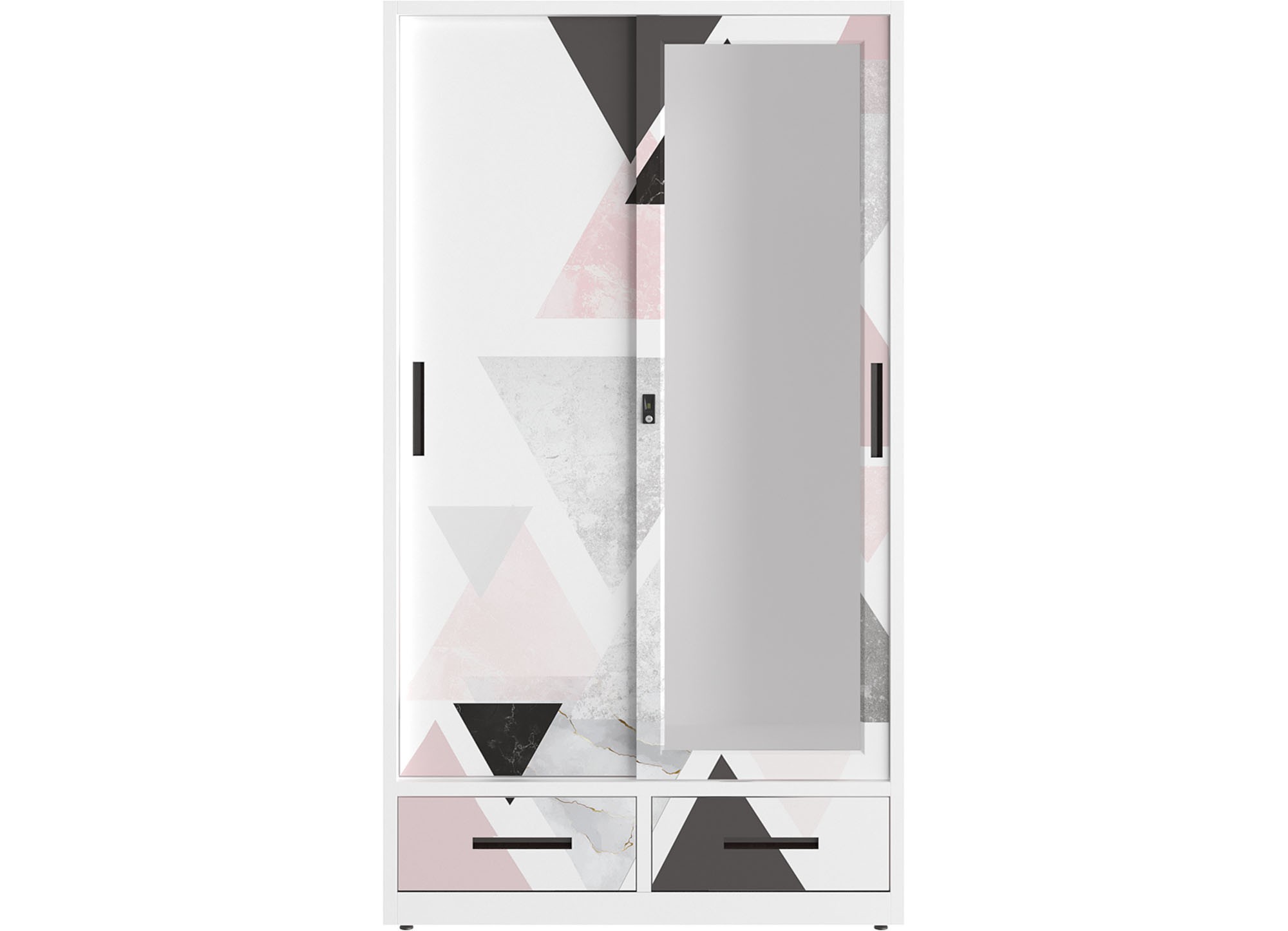 Tủ quần áo 2 cánh lùa, phía dưới 2 ngăn kéo để đổ, phía trên chia 2 khoang, khoang phải có 1 đợt di động và 1 ngăn phụ có khóa, khoang trái có 1 suốt treo áo. Cánh lùa bên phải có lắp 1 tấm gương lớn.