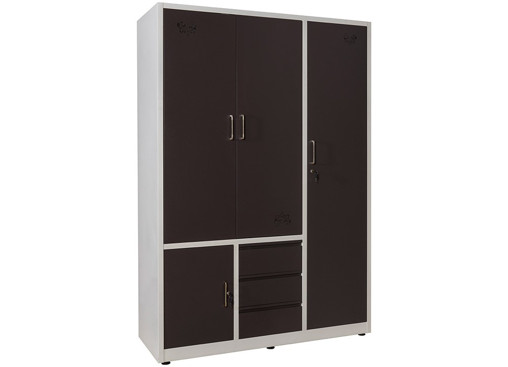 Tủ khung thép sơn tĩnh điện gồm 3 buồng, 4 cánh, 3 ngăn kéo. Cánh có hoa văn trang trí. Trong khoang 2 cánh ngắn có 1 suốt treo áo, khoang cánh sắt dài có 1 suốt treo áo và 2 đợt di động, cánh ngắn trái có 1 tấm gương.