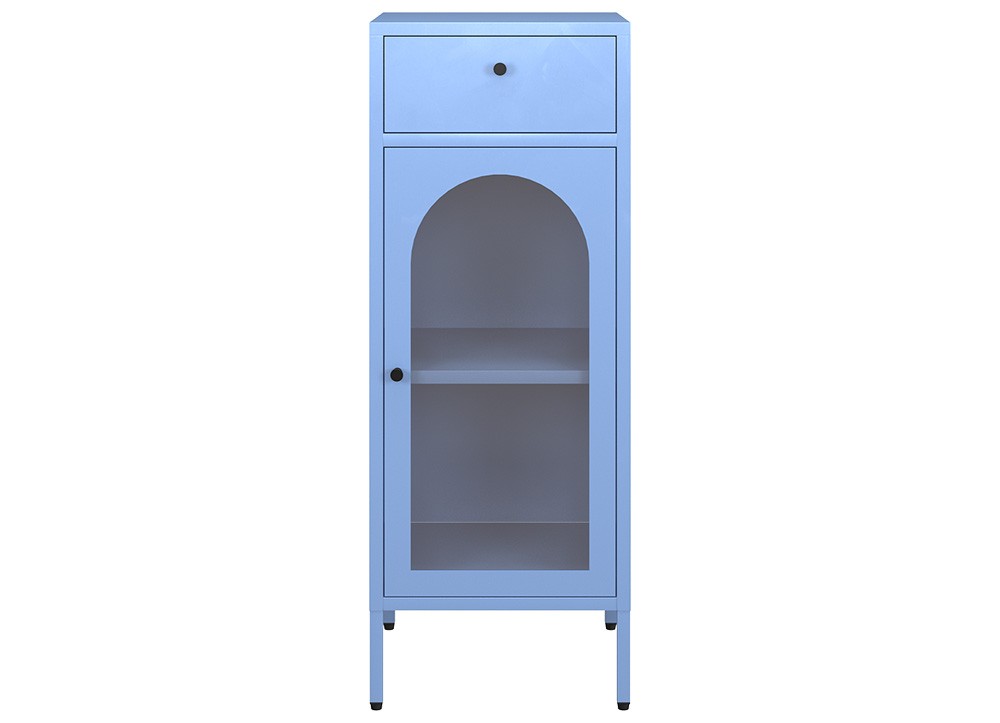 Tủ sắt để đồ gia dụng gồm 1 ngăn kéo phía trên và 1 khoang cánh kính mở phía dưới, bên trong có 1 đợt di động