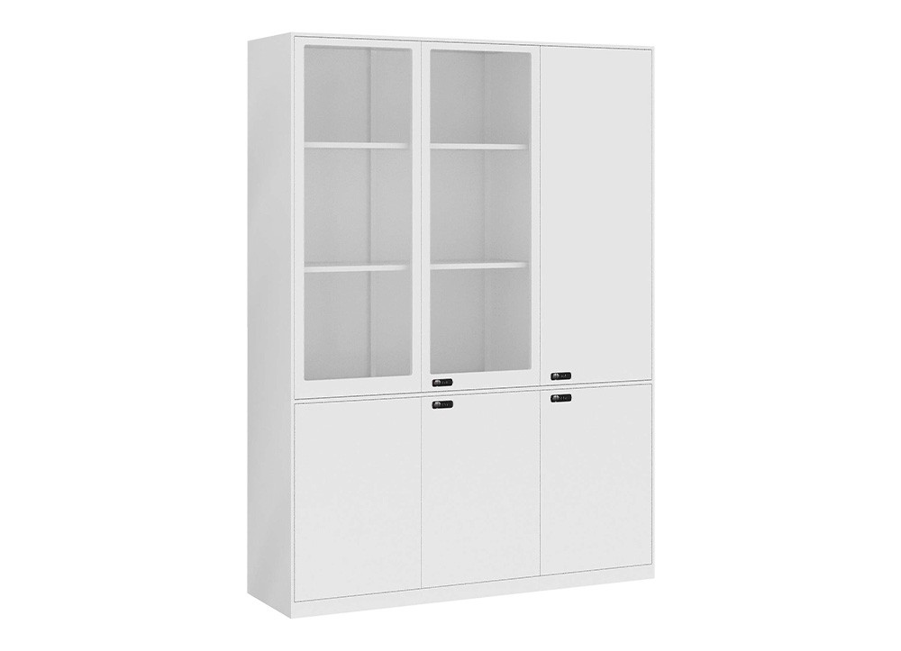 Tủ sắt sơn tĩnh điện màu trắng sáng phù hợp với không gian văn phòng hiện đại. Tủ gồm phía trên 1 khoang lớn khung cánh kính có 2 đợt di động, 1 khoang cánh sắt có suốt treo áo, phía dưới 2 khoang cánh sắt mở mỗi khoang có 1 đợt di động. Các cánh tủ sử dụng khóa số.