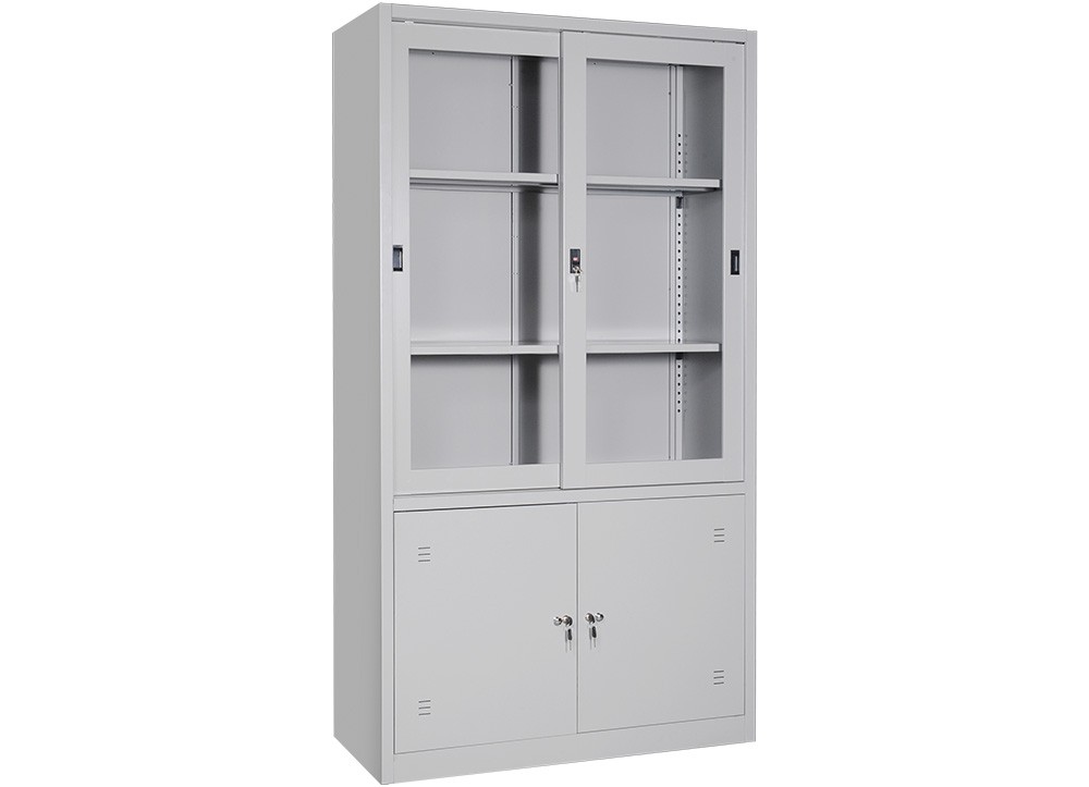 Tủ sắt sơn tĩnh điện 2 khoang: Khoang trên có 2 đợt di động và khung cánh kính lùa. Khoang dưới có 2 cánh sắt mở.
