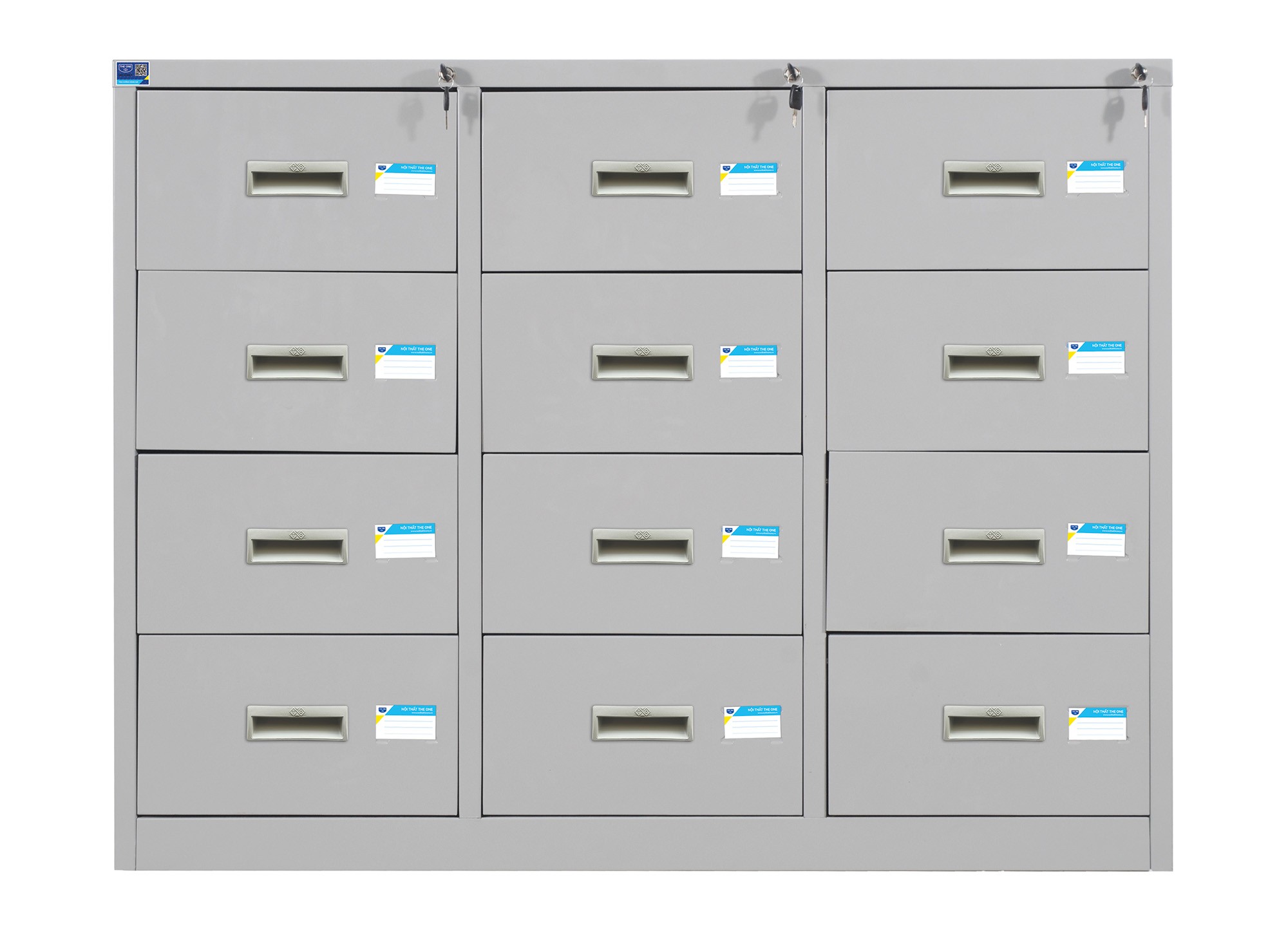 Tủ sắt sơn tĩnh điện gồm 3 khoang, mỗi khoang có 4 ngăn kéo, dùng chung 1 thanh khóa dàn.