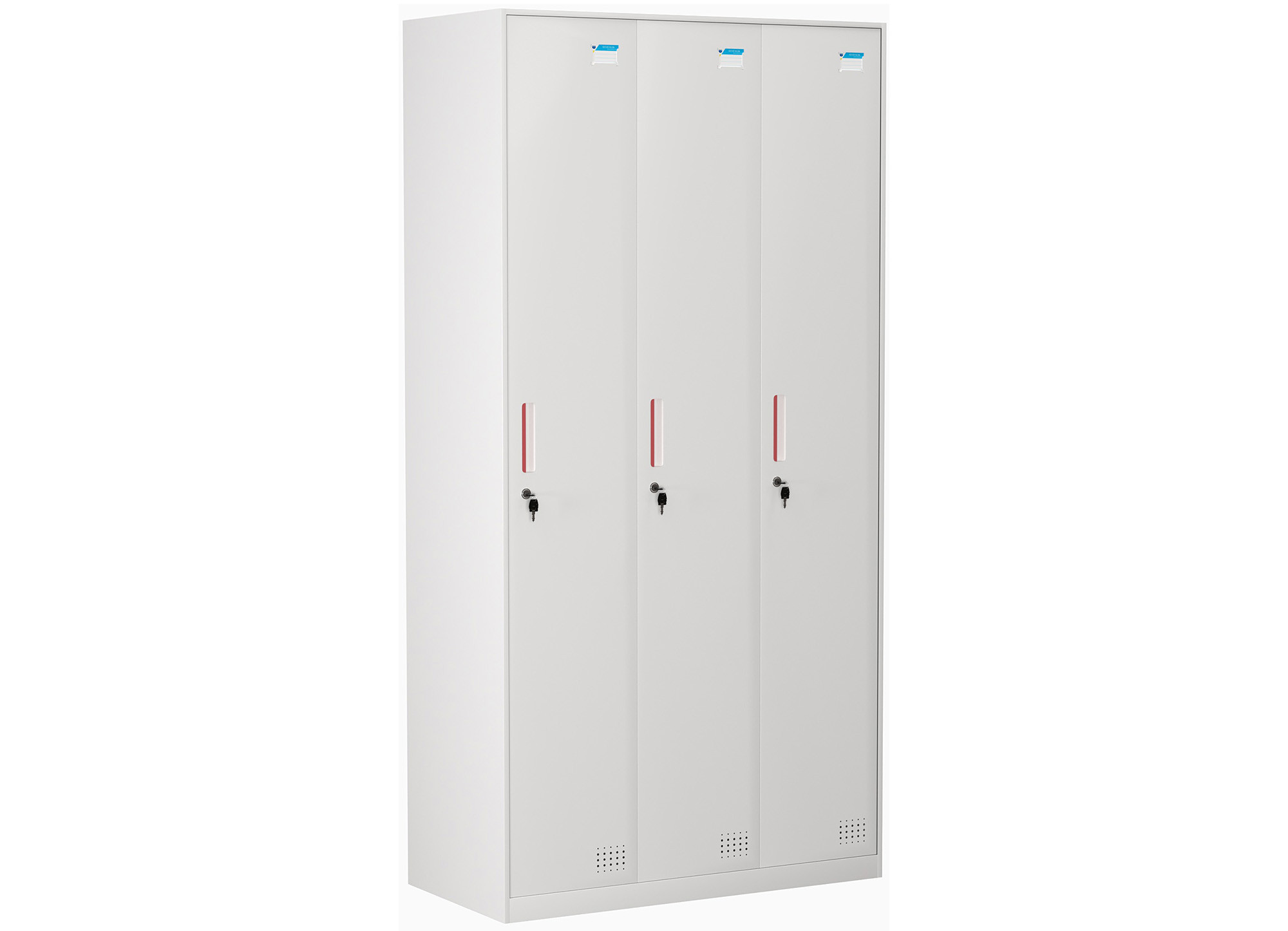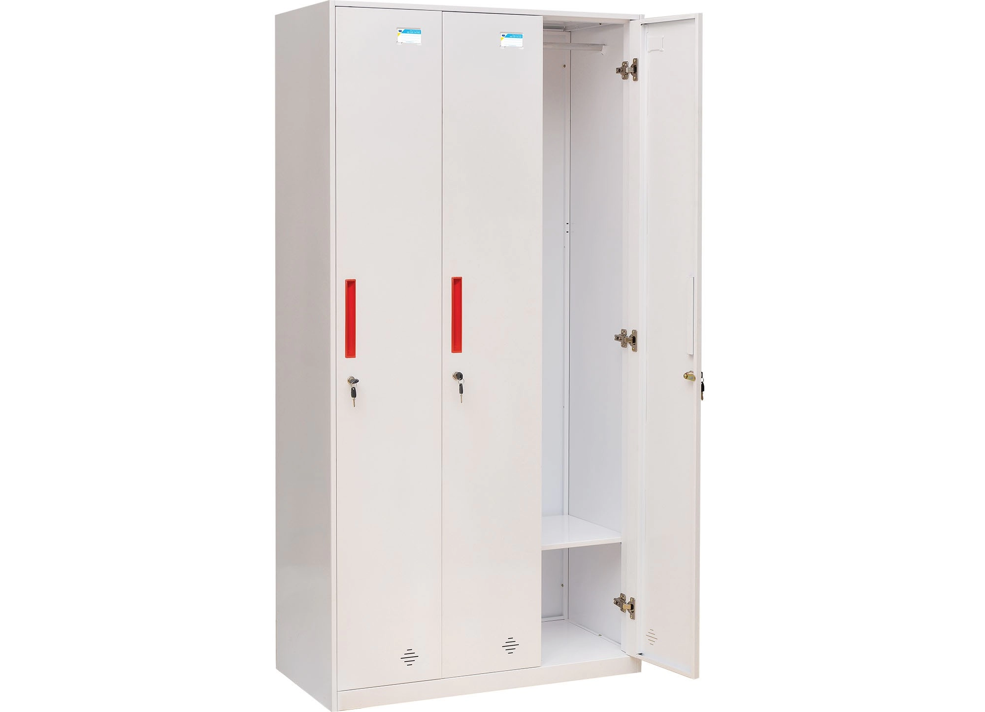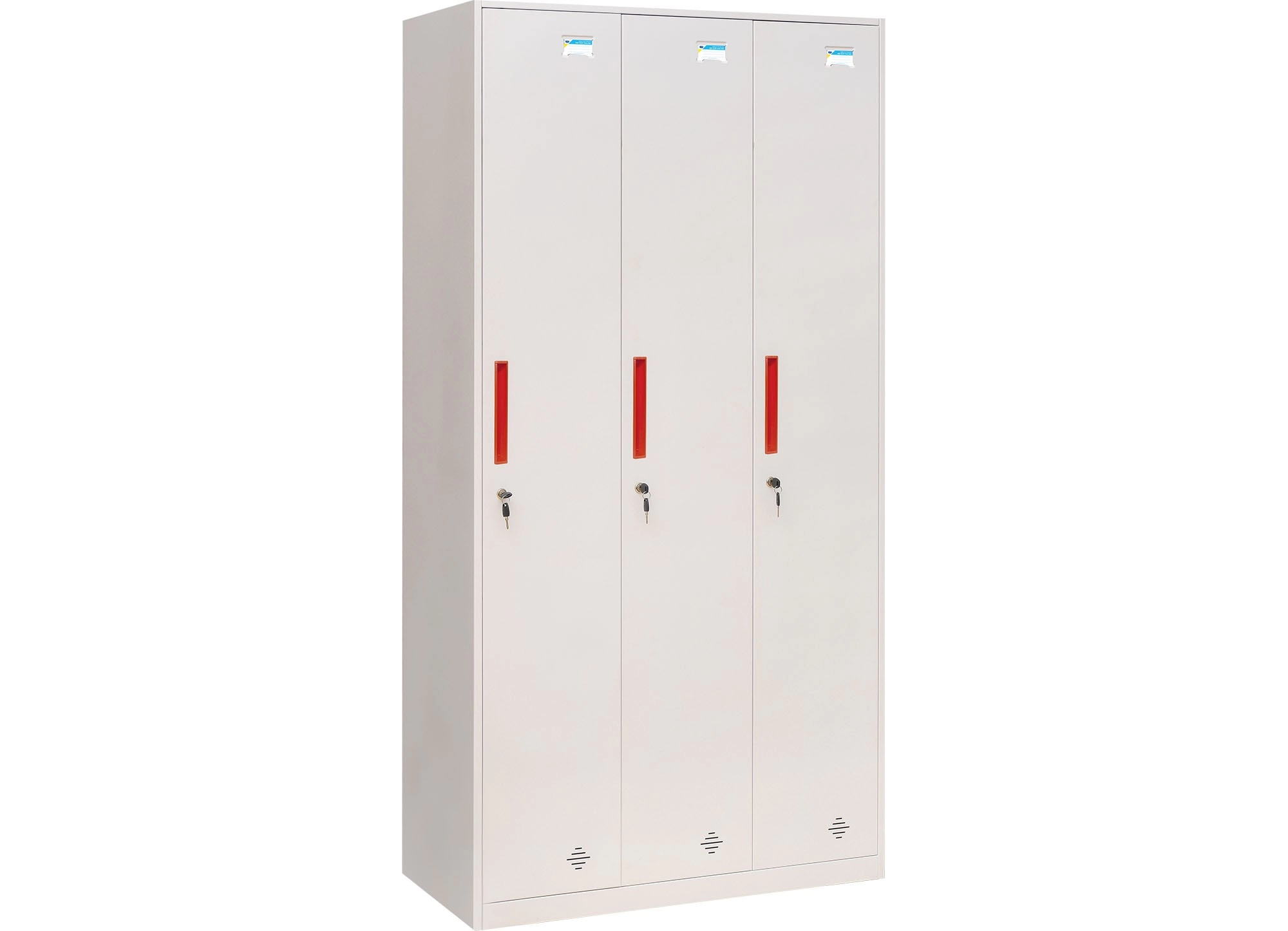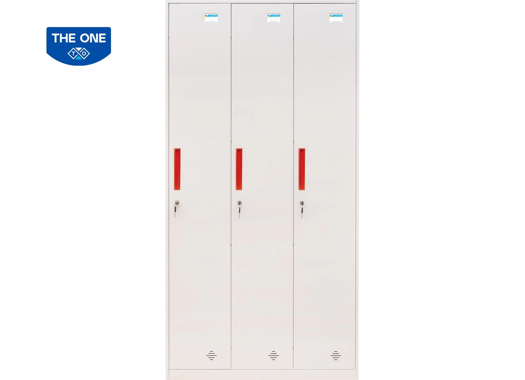 Tủ sắt hiện đại sơn tĩnh điện màu trắng S26, tay nắm âm màu cam. Tủ có 3 khoang cánh mở sử dụng khóa locker, mỗi khoang có 1 đợt cố định và 1 suốt treo áo.