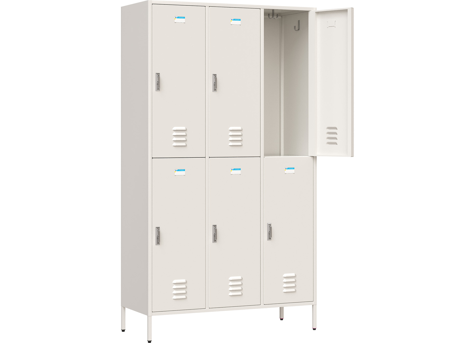 Tủ sắt sơn tĩnh điện màu trắng ngà. Tủ có 6 khoang cánh mở, bên trong mỗi khoang 3 móc treo áo đơn, 1 móc treo áo đôi. Cánh sử dụng tay nắm cao cấp kèm hệ thống thanh khóa tự sập khi đóng