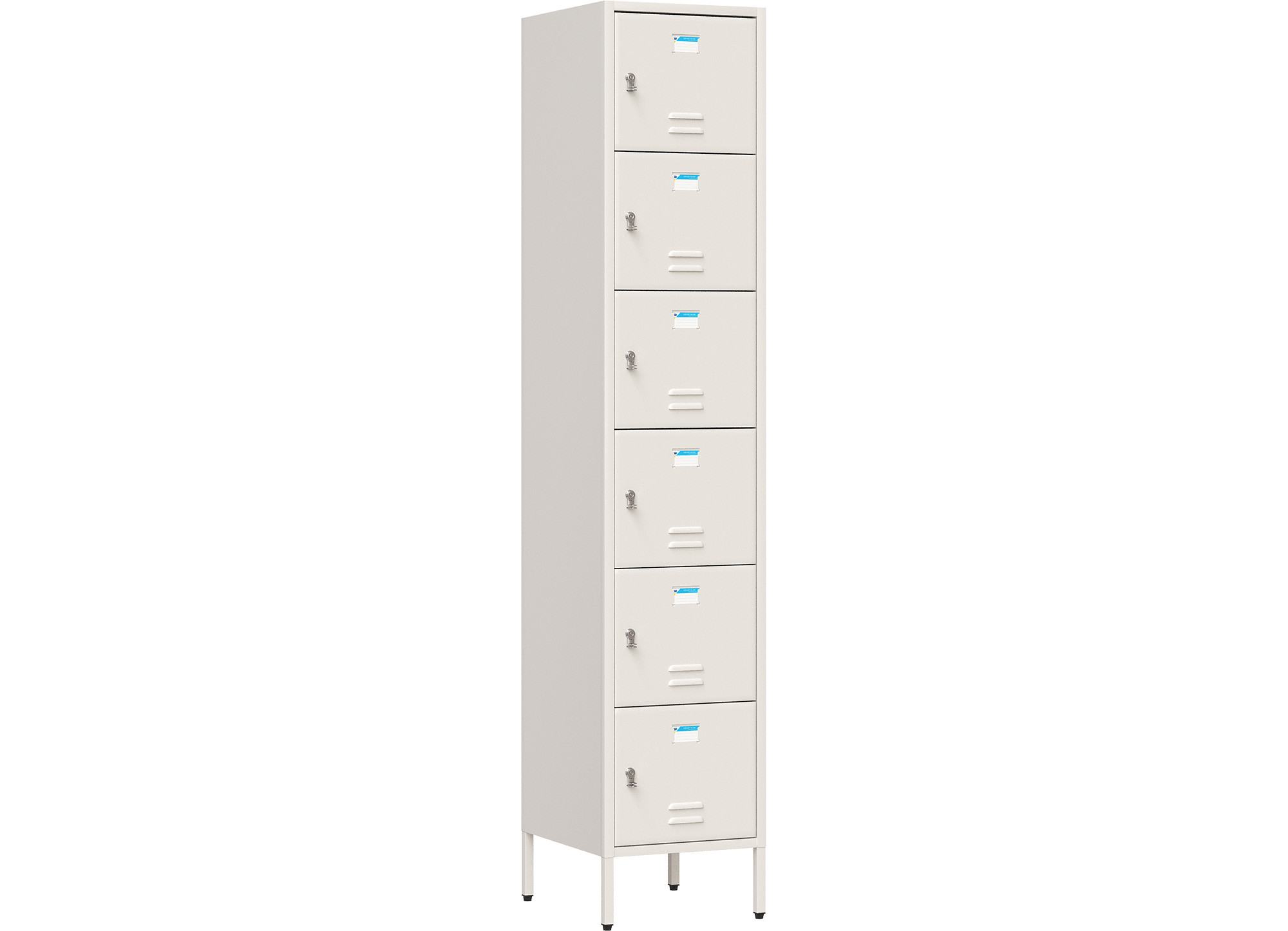 Tủ sắt sơn tĩnh điện màu trắng ngà. Tủ có 6 khoang cánh mở. Trên mỗi cánh có 1 tai khóa móc.