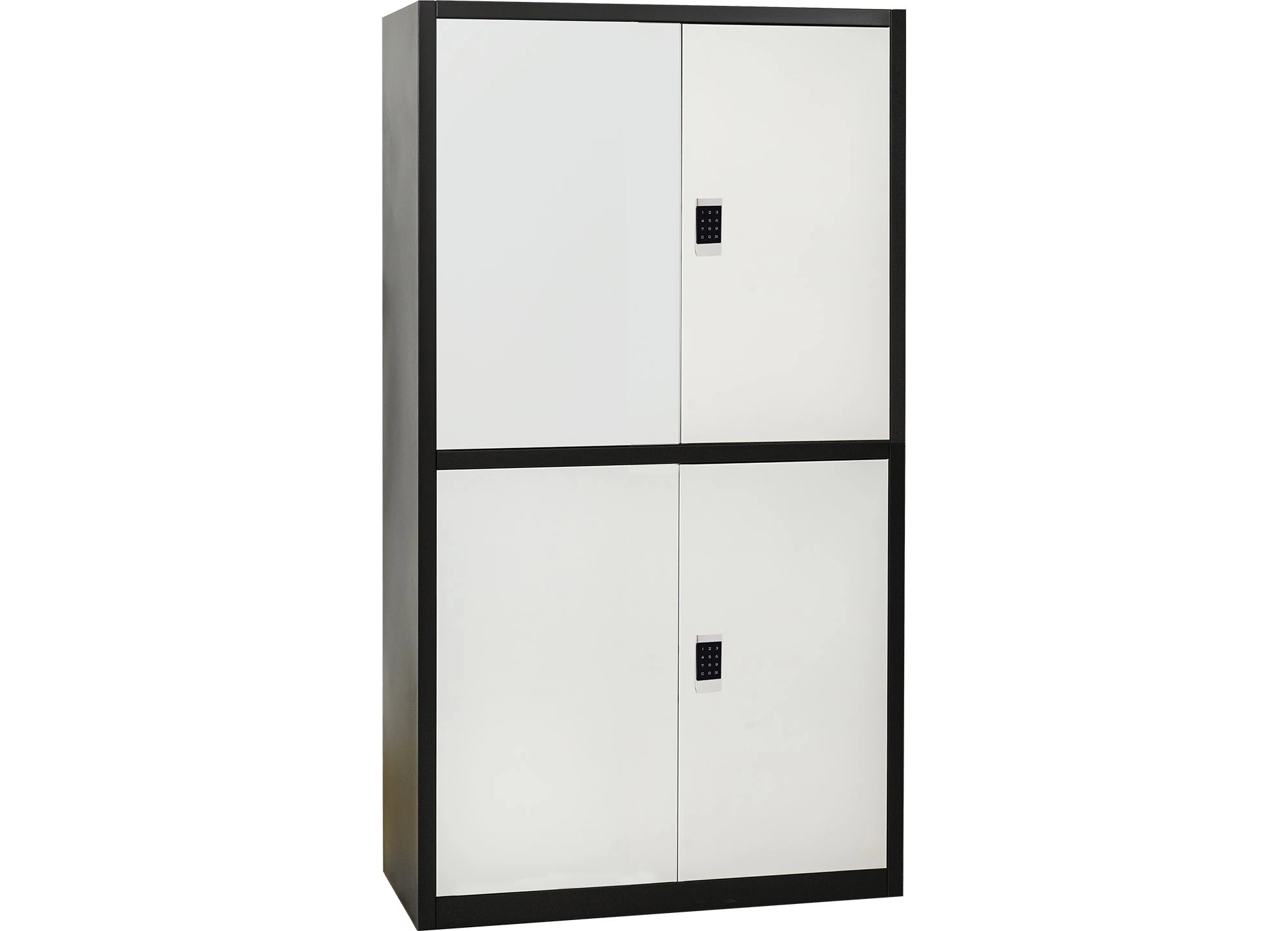 Tủ sắt an toàn sử dụng thép dày sơn tĩnh điện màu cà phê-trắng. Tủ gồm 2 khoang, mỗi khoang có 1 đợt di động. Cánh tủ trên và dưới được lắp khóa điện tử cao cấp.