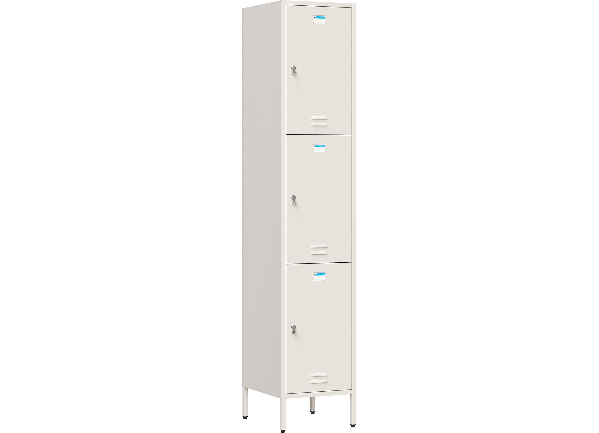 Tủ sắt sơn tĩnh điện màu trắng ngà. Tủ có 3 khoang cánh mở, bên trong mỗi khoang 3 móc treo áo đơn, 1 móc reo áo đôi.
