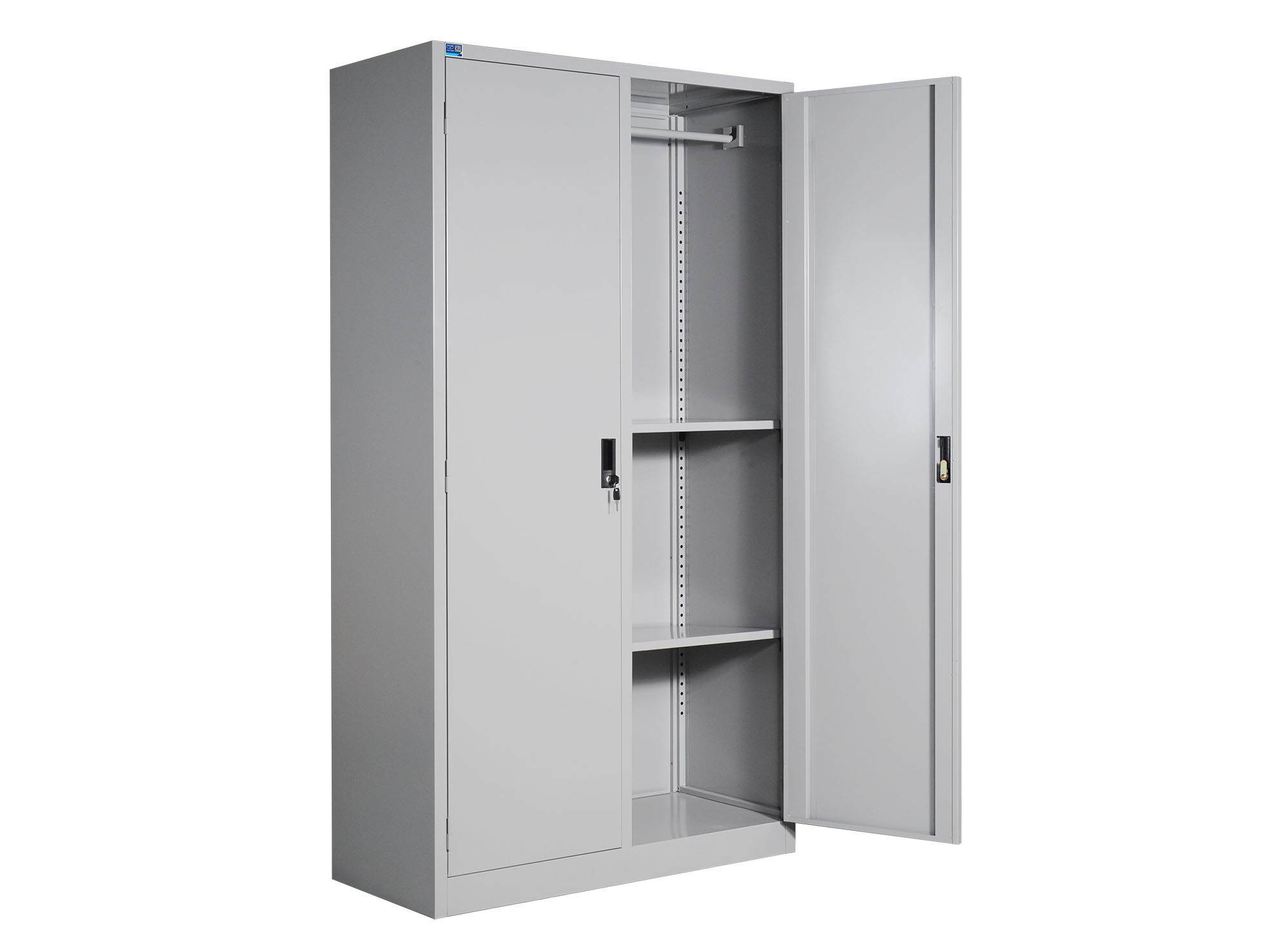 Tủ sắt sơn tĩnh điện gồm 2 khoang cánh mở, mỗi khoang có 2 đợt di động và một suốt treo quần áo.
