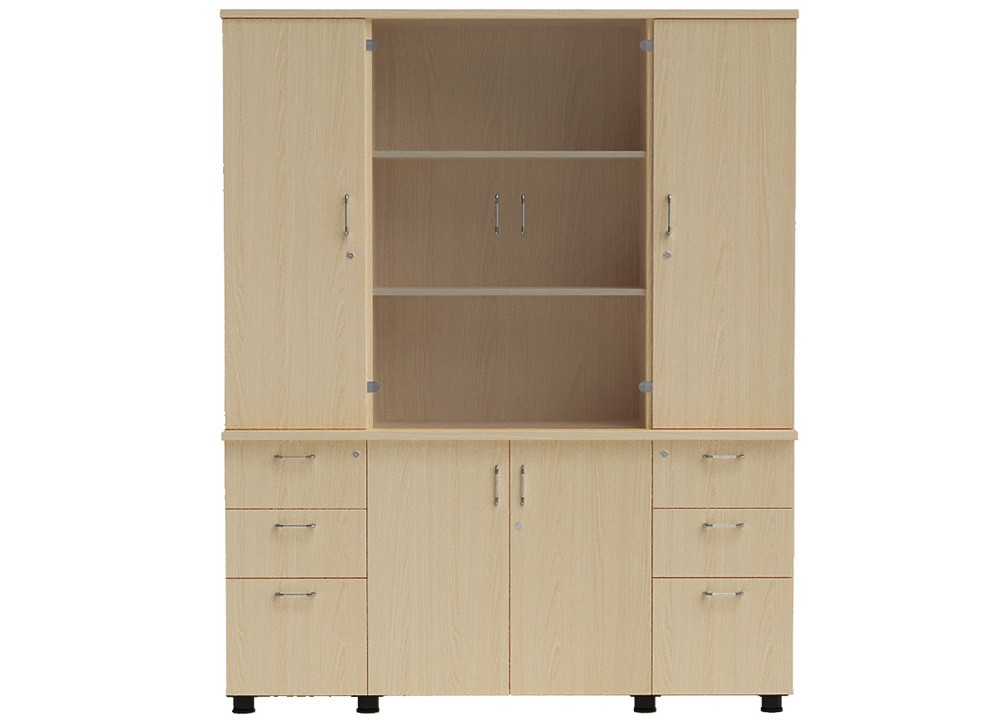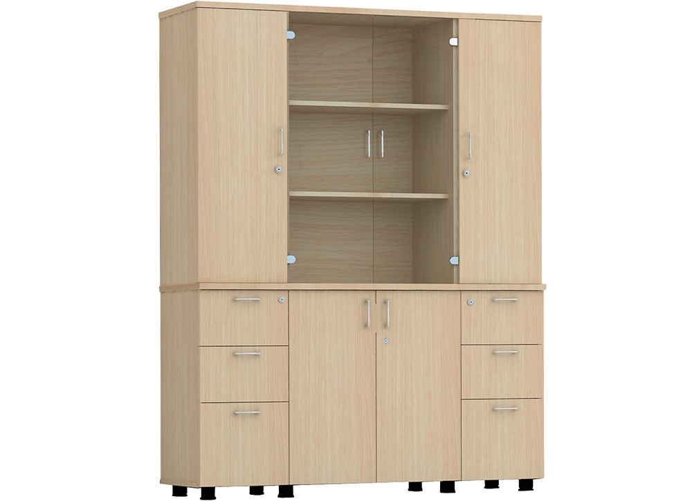Tủ văn phòng 4 buồng, khoang trên có 2 cánh kính giữa để tài liệu, hai bên cánh đặc.