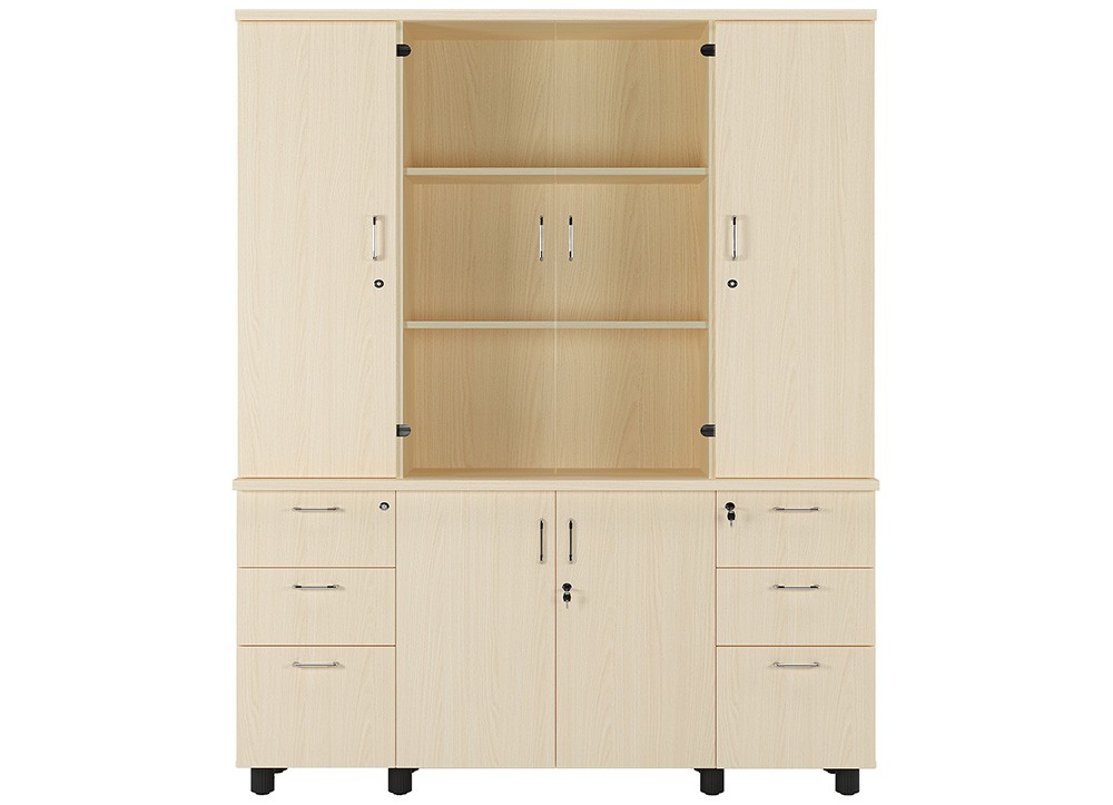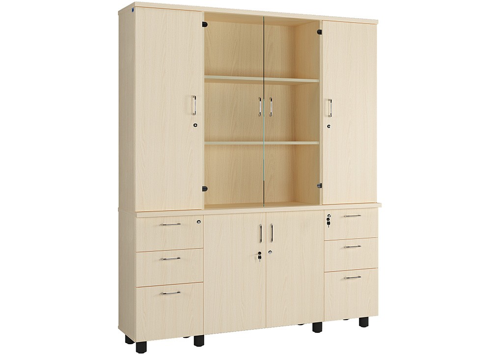 Tủ tài liệu 4 khoang, khoang trên có 2 cánh kính giữa để tài liệu, hai bên cánh đặc. Khoang dưới giữa 2 cánh mở, 2 bên có ngăn kéo