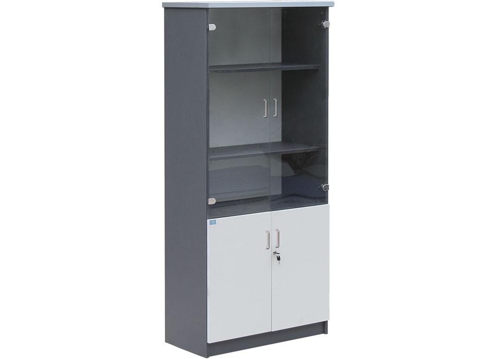 Tủ gỗ 2 khoang cánh kính mở phía trên có đợt và khoang dưới có cánh gỗ mở.