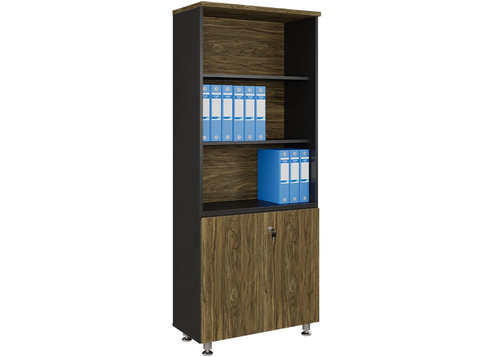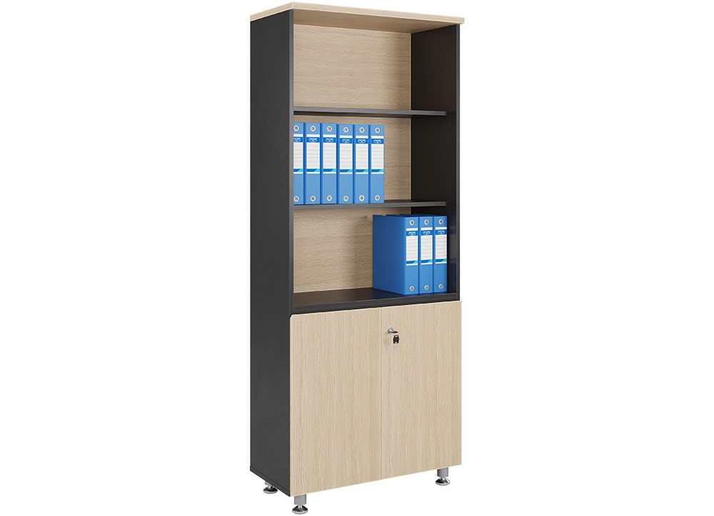 Tủ tài liệu gỗ melamine phía trên có 3 ngăn để file, phía dưới có 2 khoang cánh mở. Sử dụng tay nắm vát cạnh và có khóa.