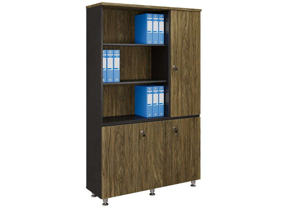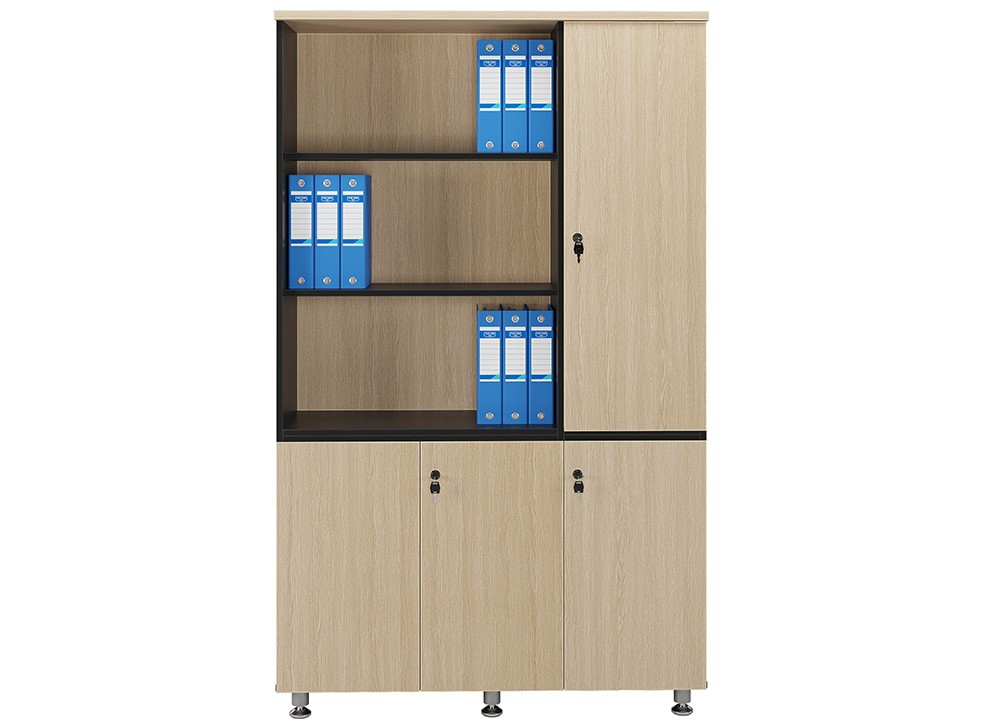 Tủ tài liệu 3 khoang gỗ Melamine, phía trên có 3 khoang tài liệu không cánh và 1 khoang treo áo, phía dưới có 3 khoang cánh mở và có khóa.