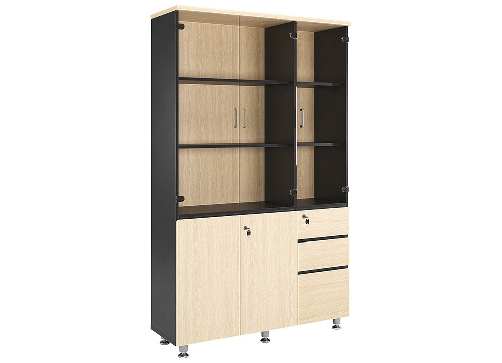 Tủ tài liệu 3 khoang gỗ Melamine, phía trên có 3 cánh kính và đợt di động, phía dưới có 2 khoang cánh mở và 3 ngăn kéo để đồ. Sử dụng tay nắm vát cạnh và có khóa.