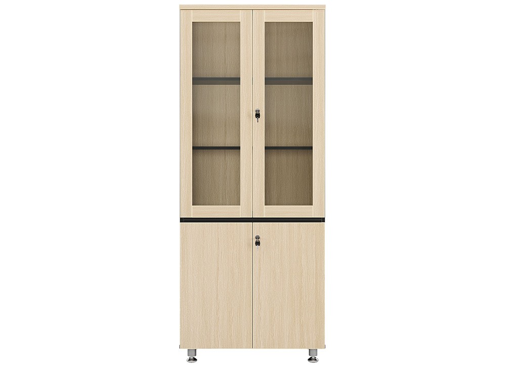 Tủ tài liệu 2 khoang gỗ Melamine, phía trên là 2 cánh khung kính để tài liệu, phía dưới là hai khoang cánh mở. Sử dụng tay nắm vát cạnh và có khóa.