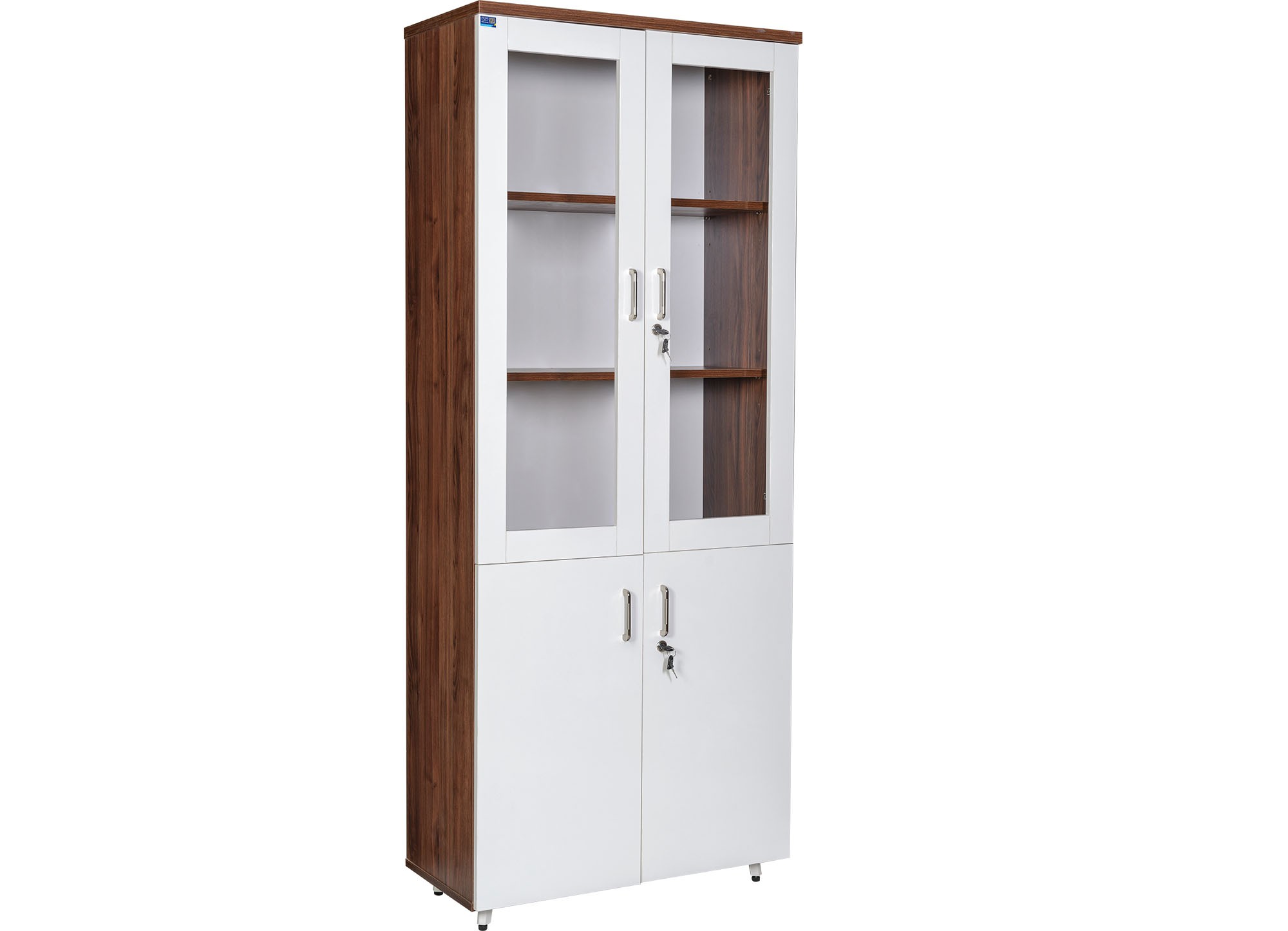 Tủ tài liệu gỗ công nghiệp Melamine cao cấp. Khoang trên tủ sử dụng khung cánh kính và có 2 ngăn di động. Khoang dưới có hai cánh, bên trong có 1 ngăn di động