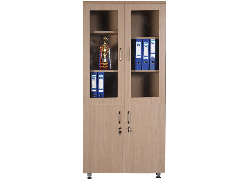 Tủ tài liệu 2 khoang, phía trên là 2 khoang cánh kính để tài liệu, phía dưới là hai khoang cánh mở.