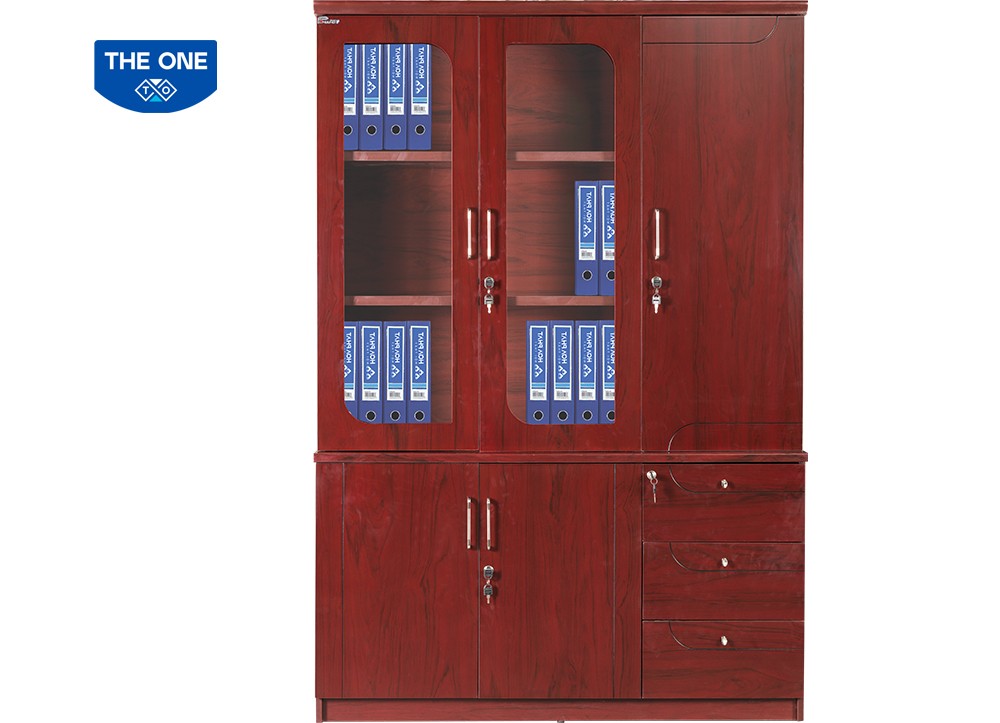 PU Office Cabinet includes 2 compartments with glass doors and 1 compartment for hanging clothes above. There are 3 drawers and 2 compartments with wooden hinged doors below.